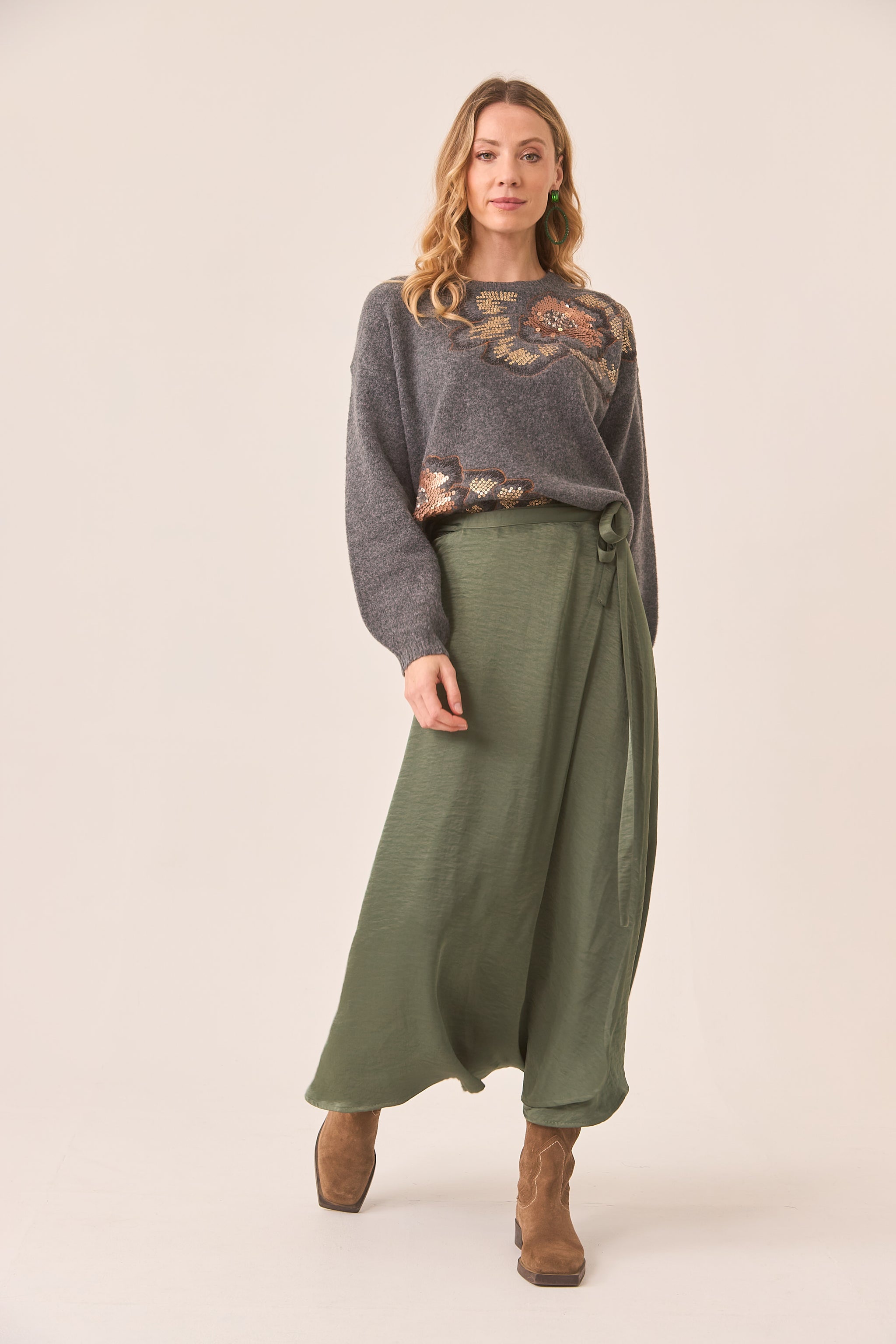 Falda larga en tejido satinado, cruzada y anudada en la cintura.