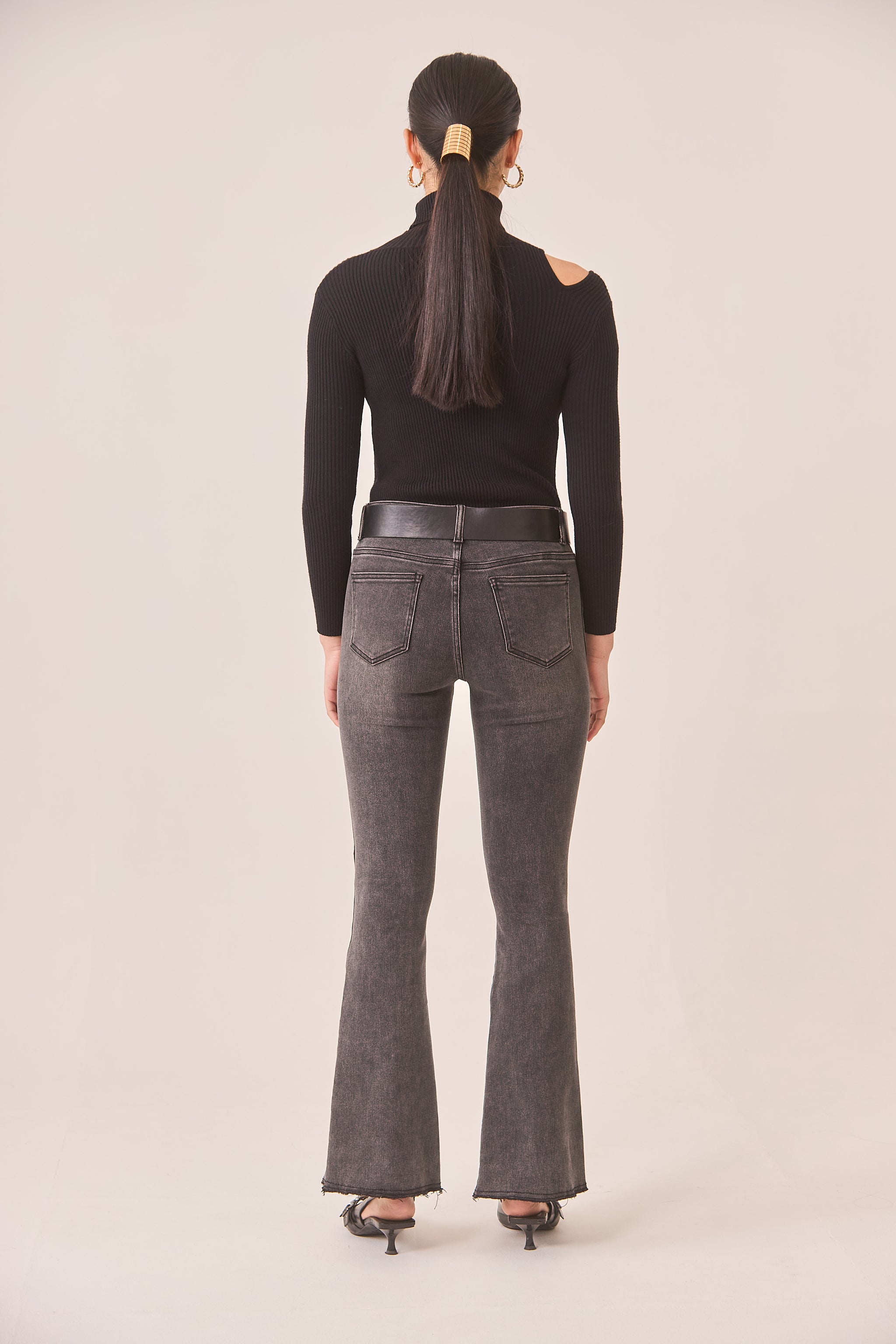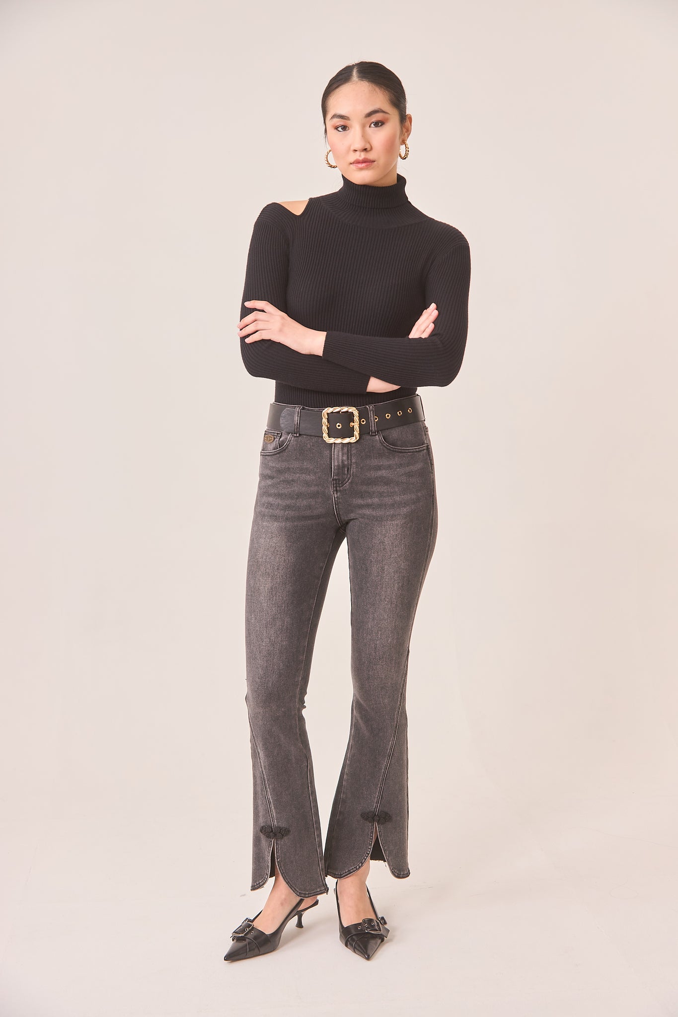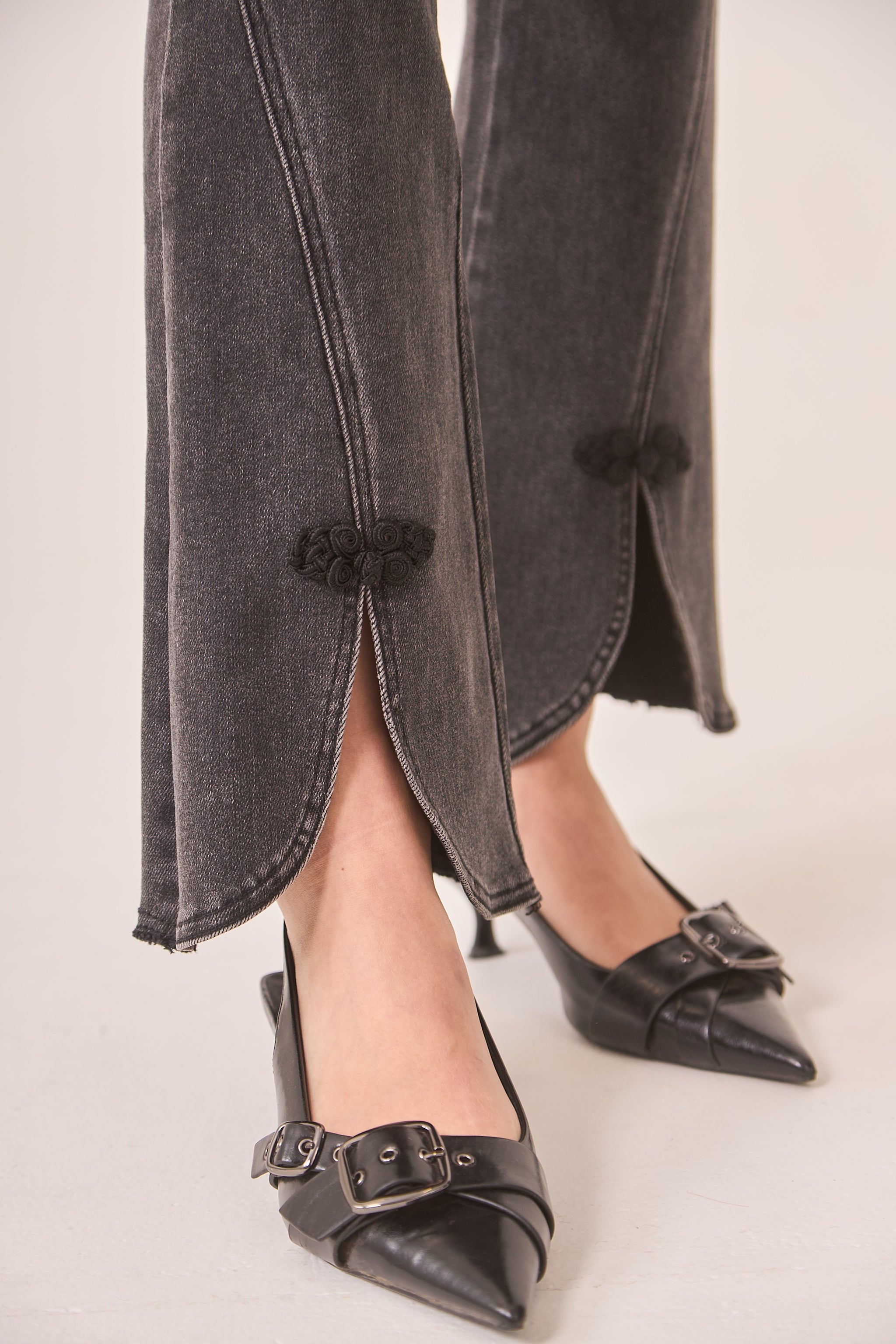 Pantalón en tejido denim de tiro medio con abertura en el frontal del bajo y cierre con botón de cordón trenzado al estilo oriental. Cierre de botón y cremallera.