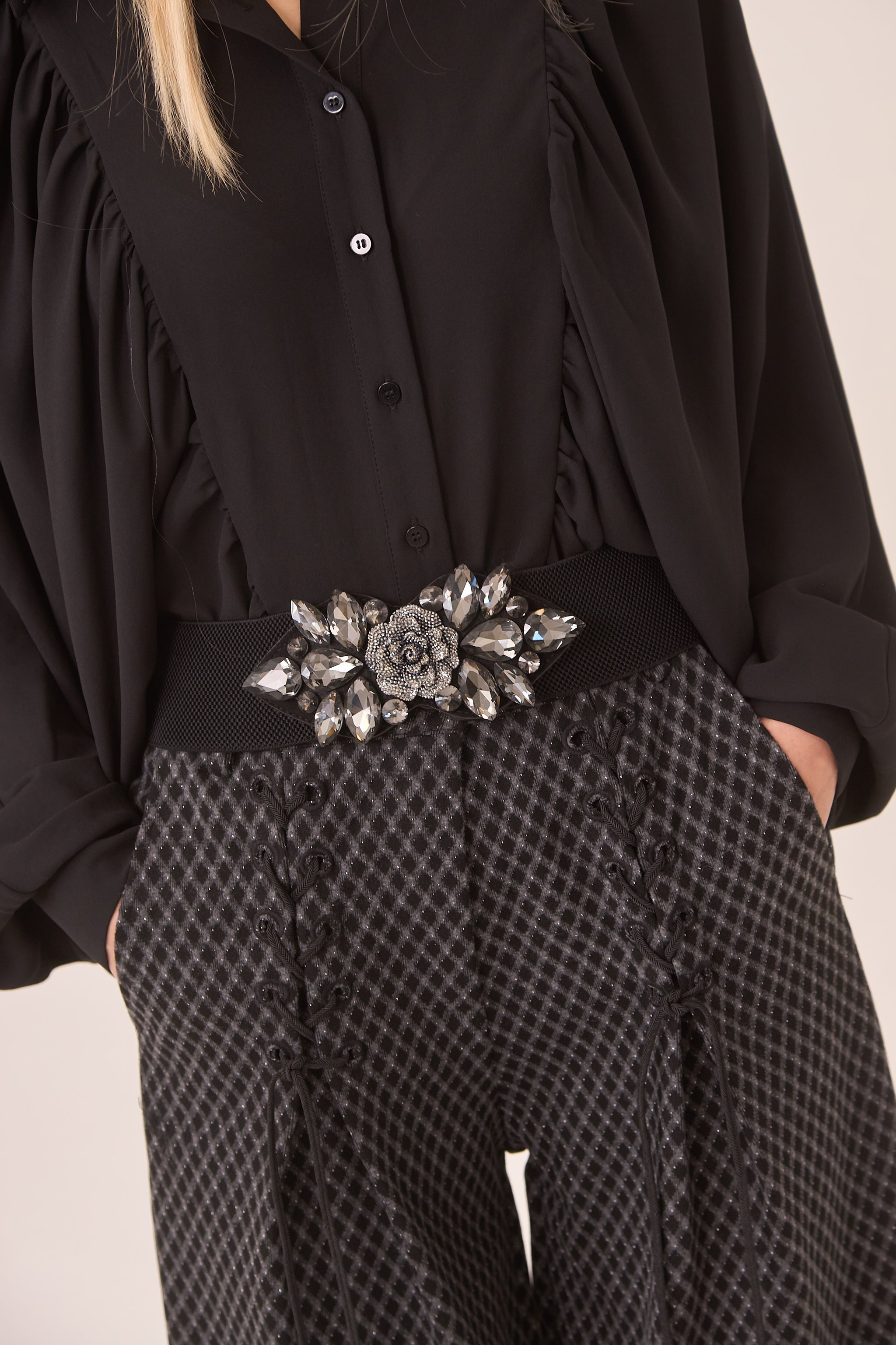 Pantalón en tejido jacquard con lazadas en caderas de estilo corsetero. Cintura en contraste con pieza decorativa de piedras. Cierre de cremallera.