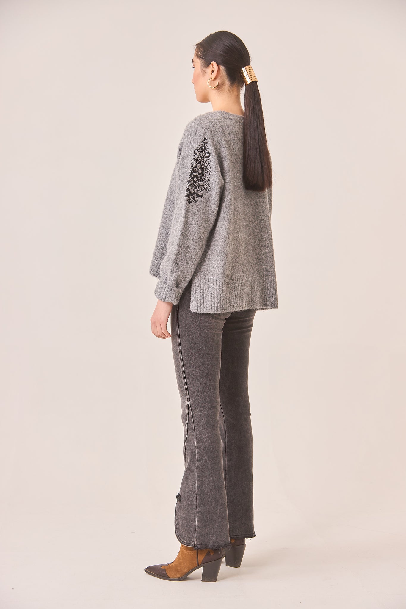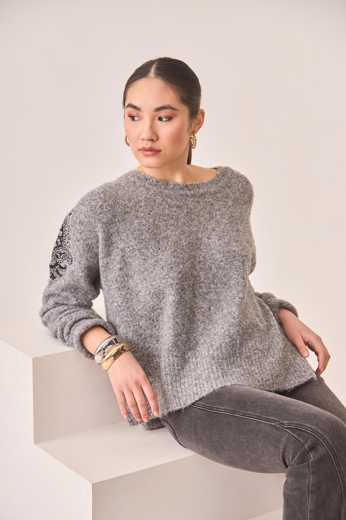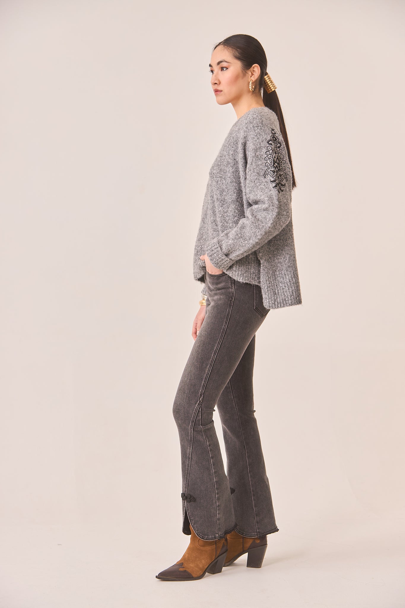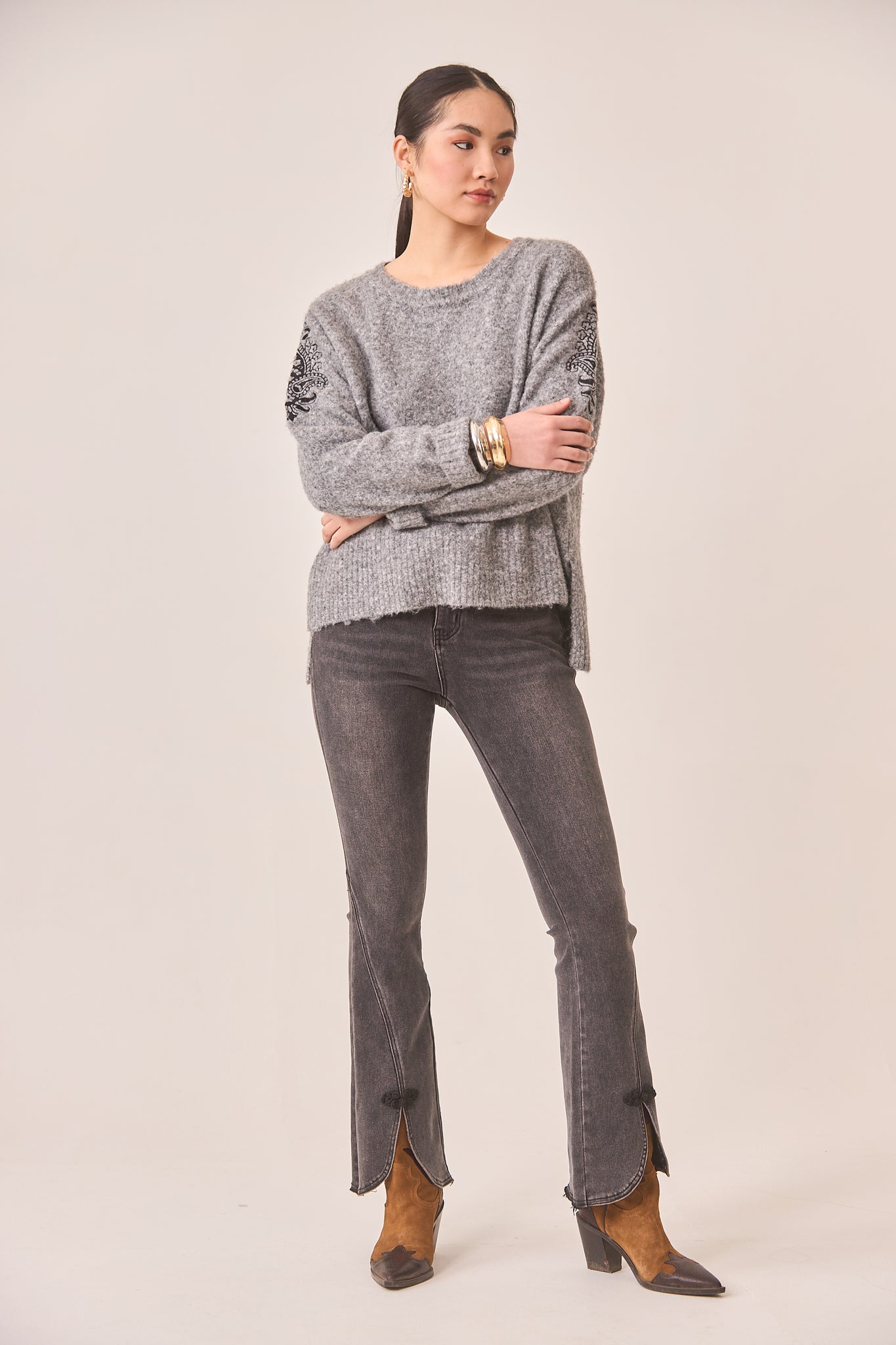 Jersey de cuello redondo con motivos bordados en las mangas. Bajo asimétrico.