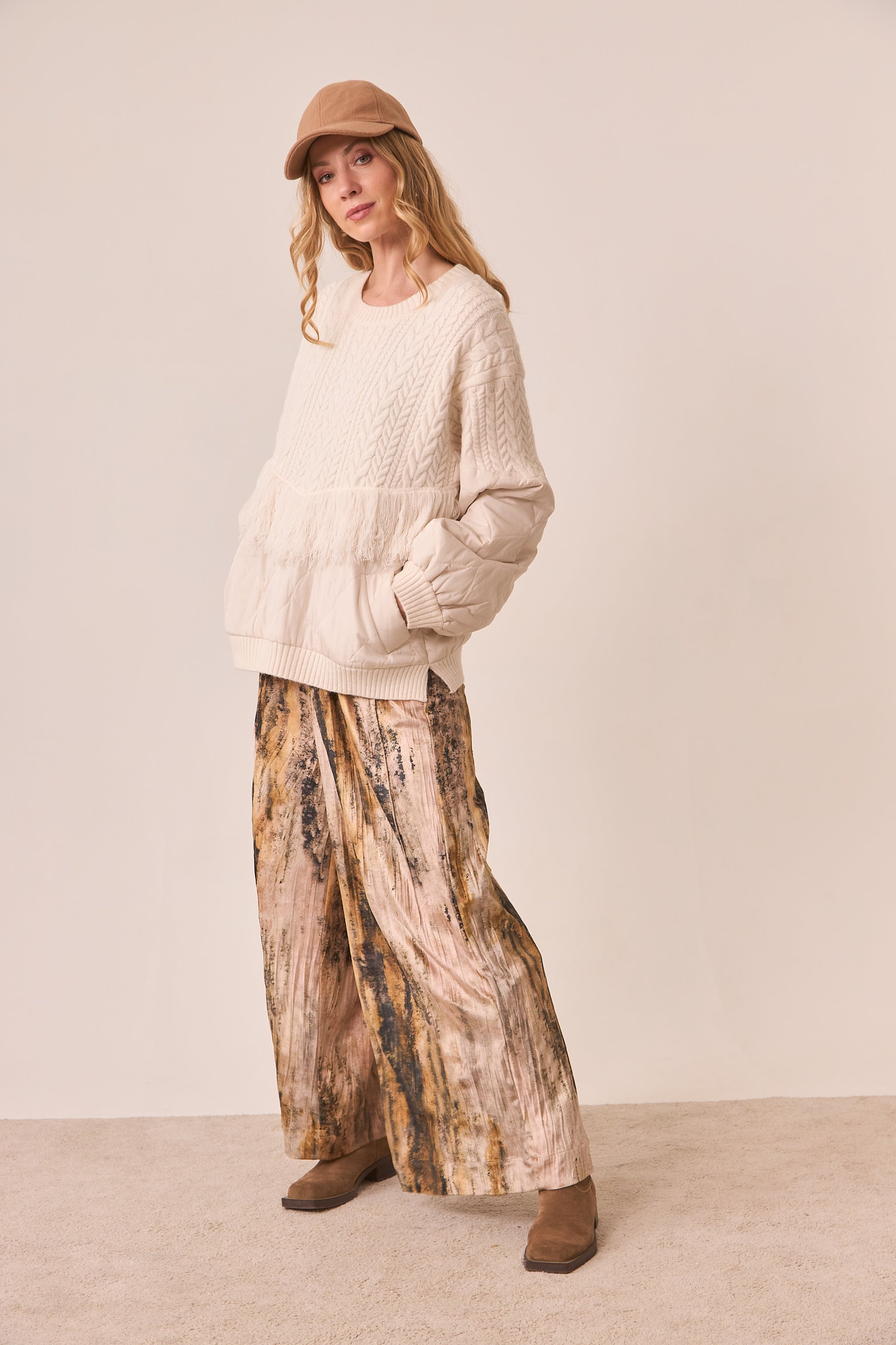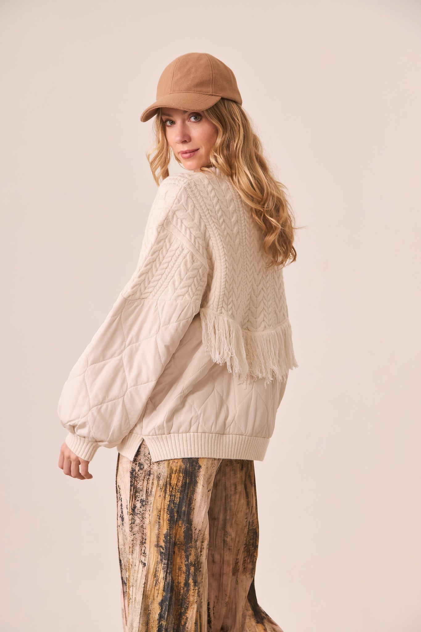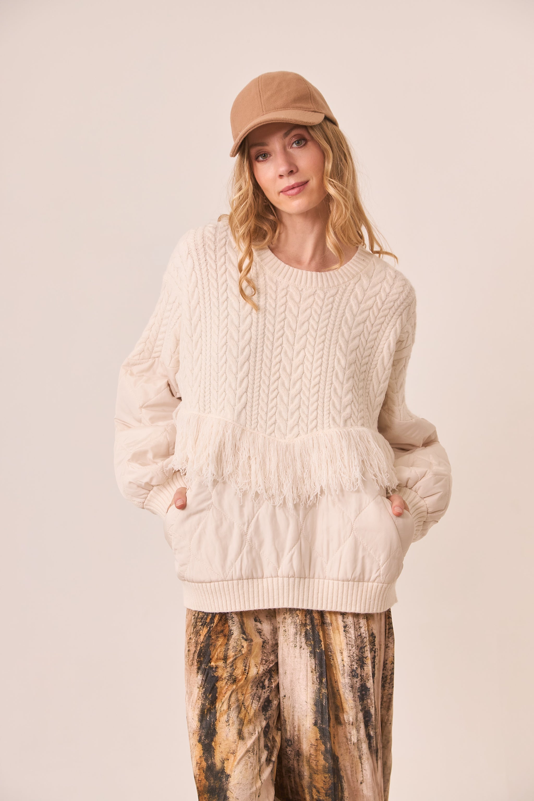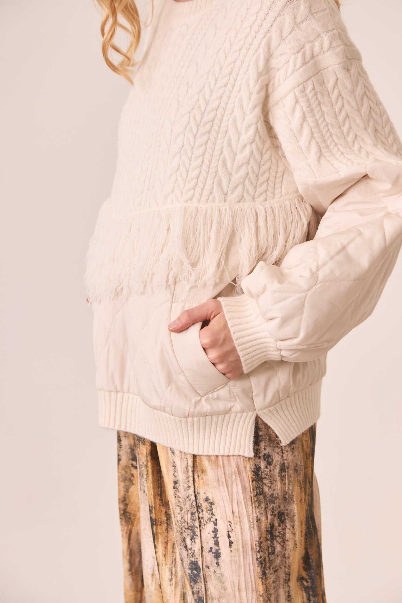 Jersey de cuello redondo combinado en punto trenzado y tejido acolchado. Detalle de flecos en la cintura.