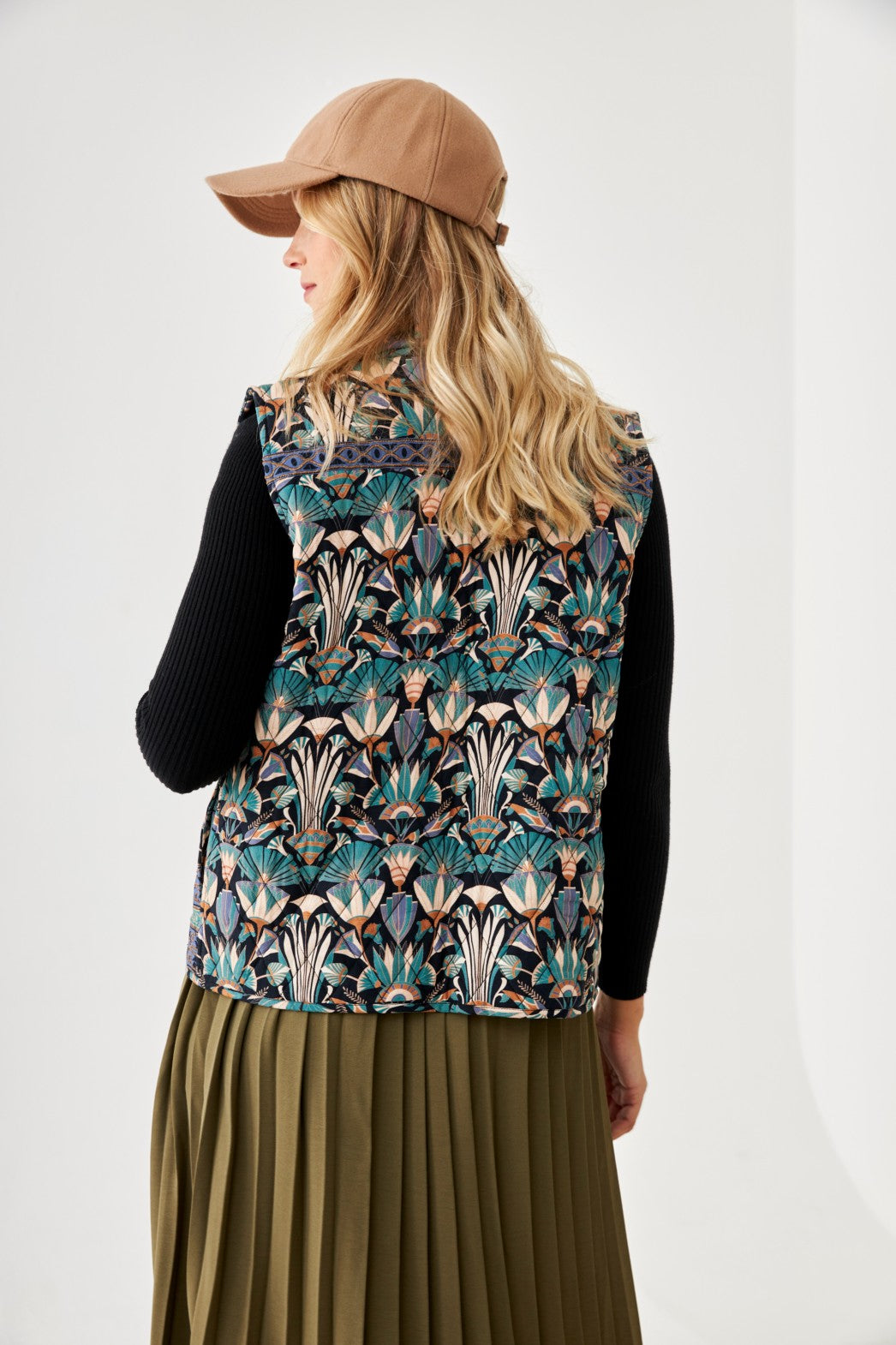 Chaleco en tejido acolchado estampado. Cuello de solapas.