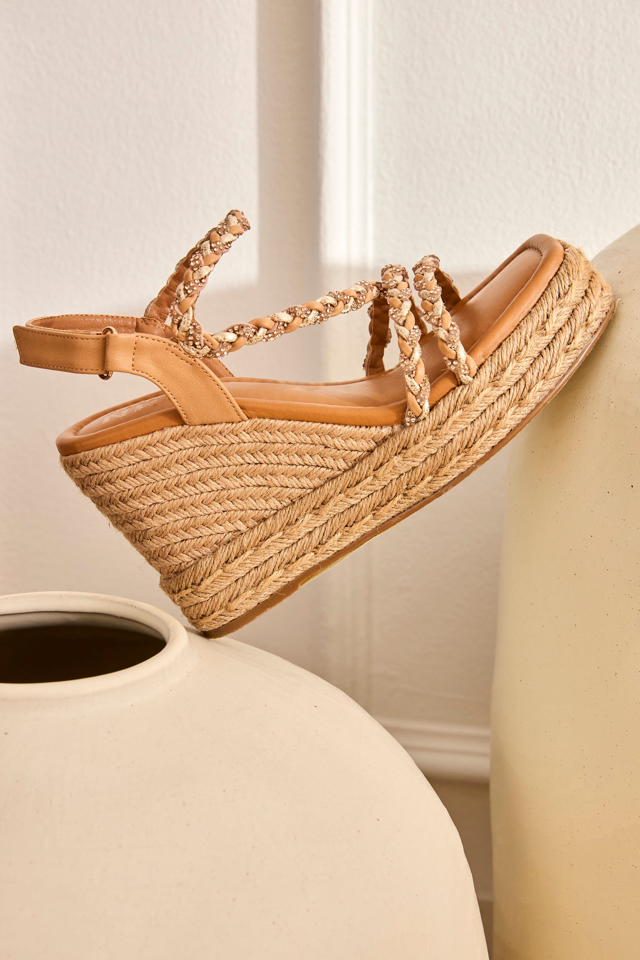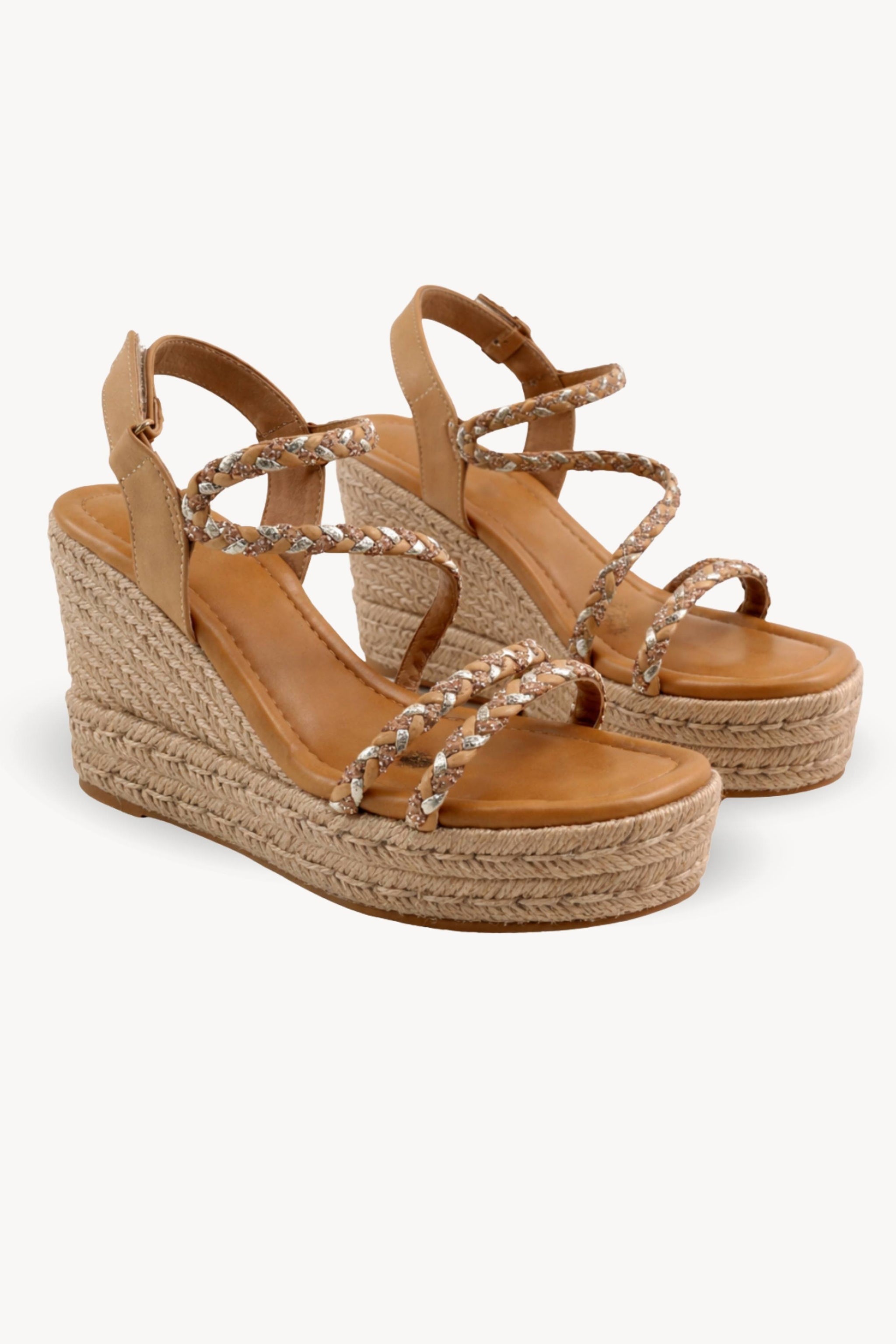 SANDALIAS CUÑAS ESPARTO TIRAS TRENZADAS STRASS - CAMEL