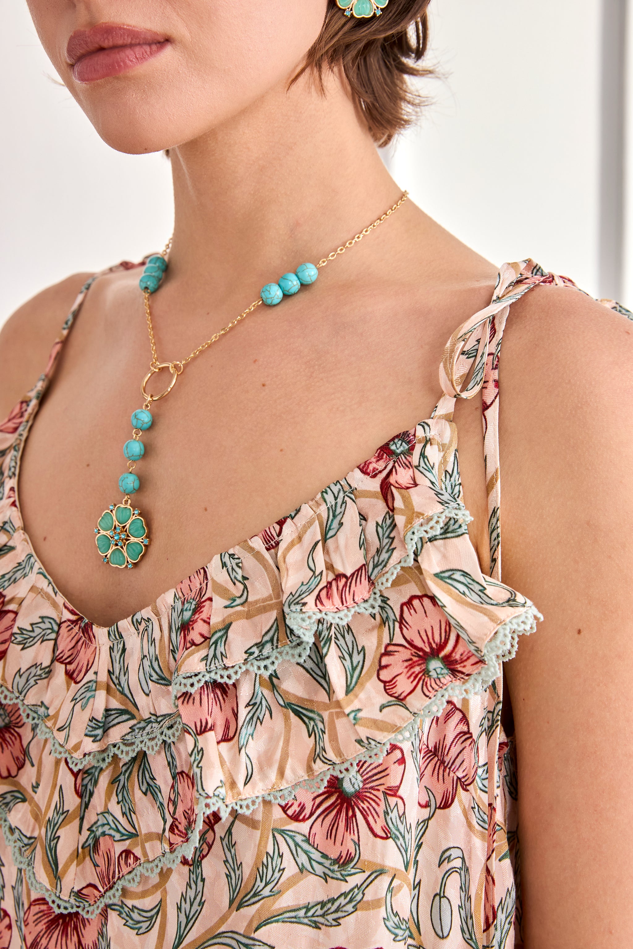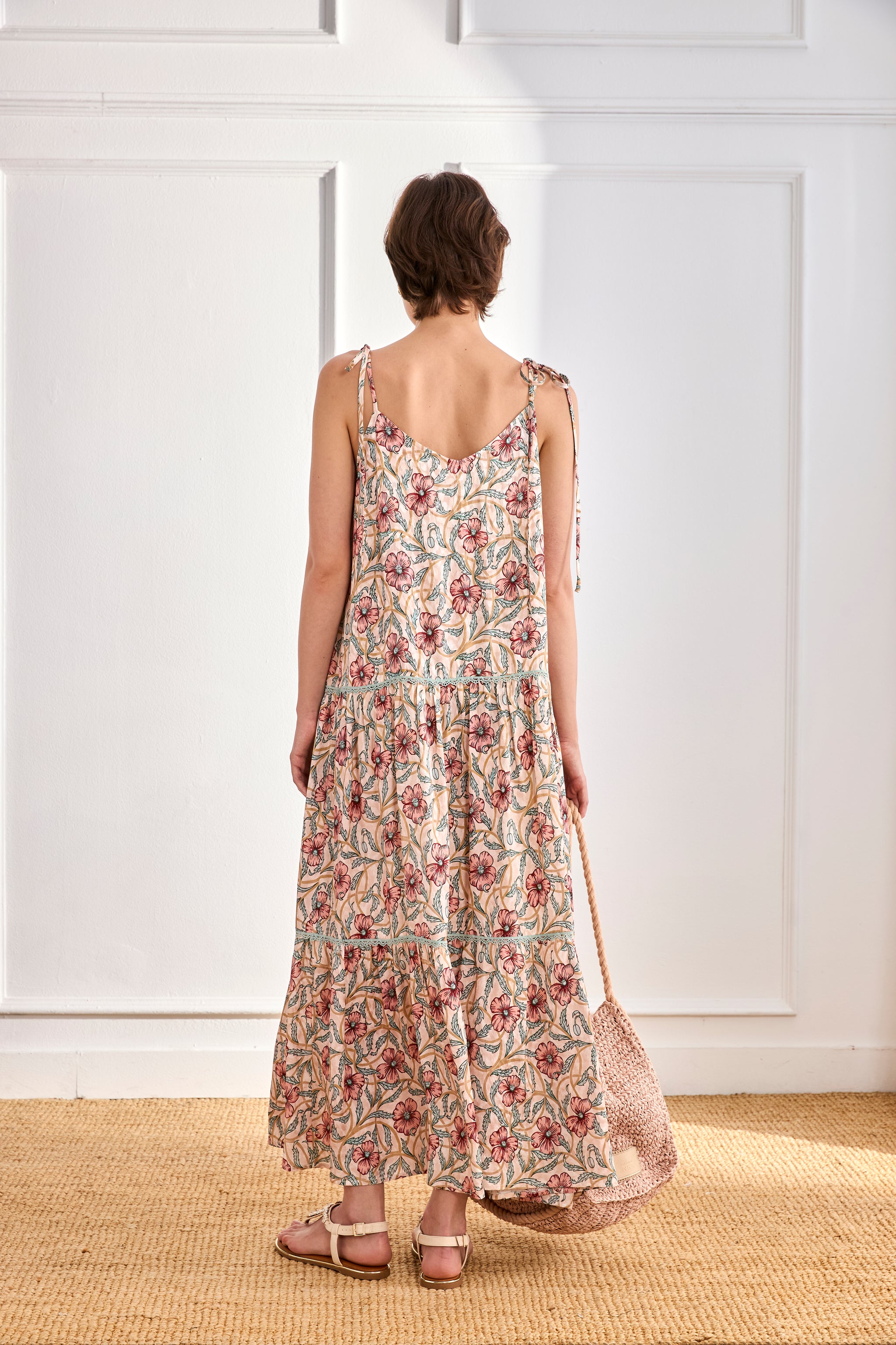 Vestido largo estampado floral de tirantes finos anudados en los hombros. Escote V delantero con volantes. Detalle de pasamanería de ganchillo en contraste de color. Bajo con volante.