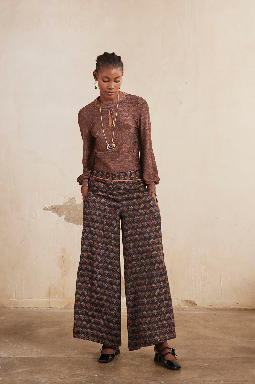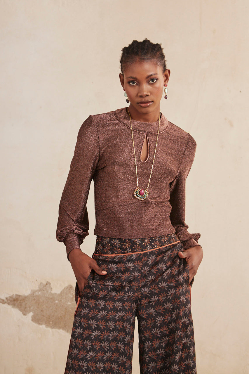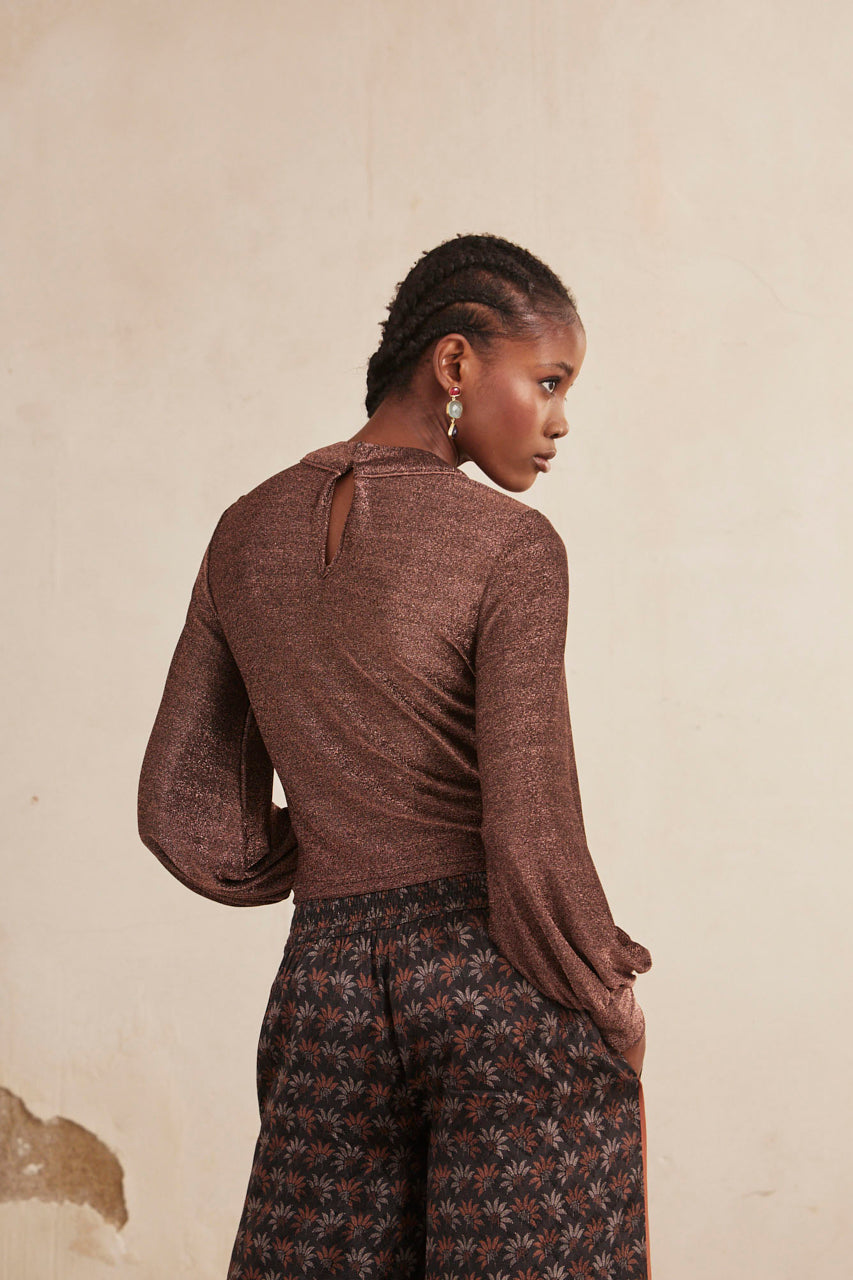 Long-sleeved blouse with teardrop neckline and lurex fabric - bronze