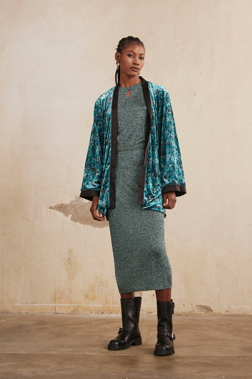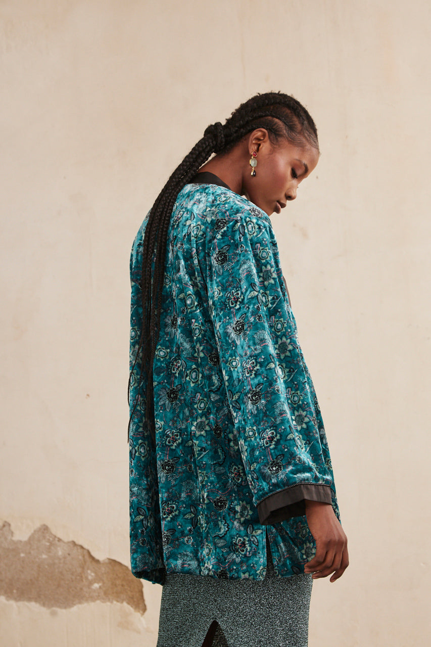 SHORT PRINTED VELVET KIMONO - TURQUOISE