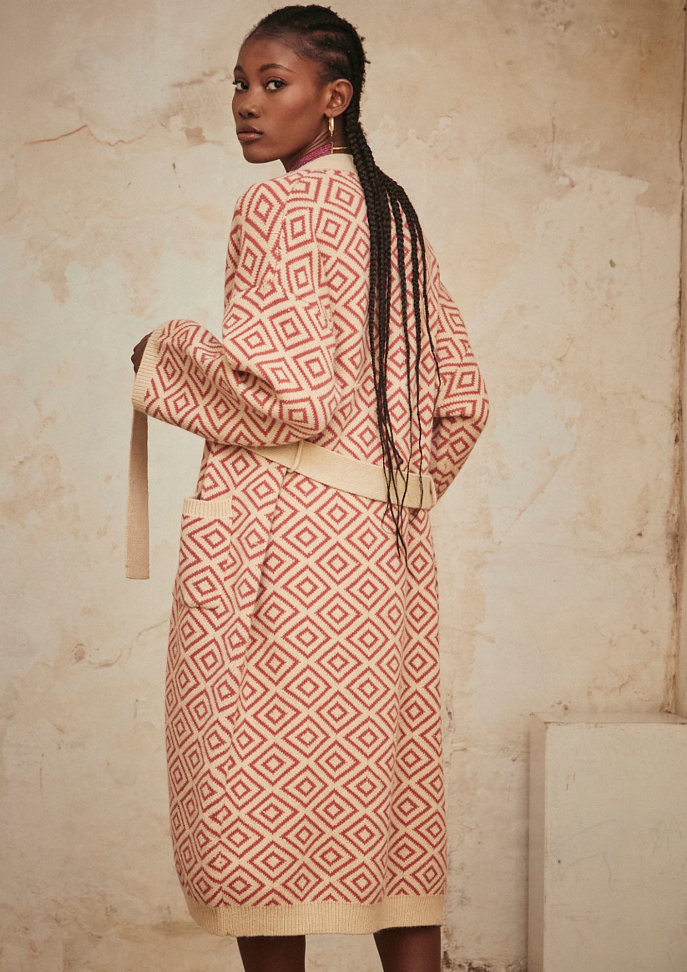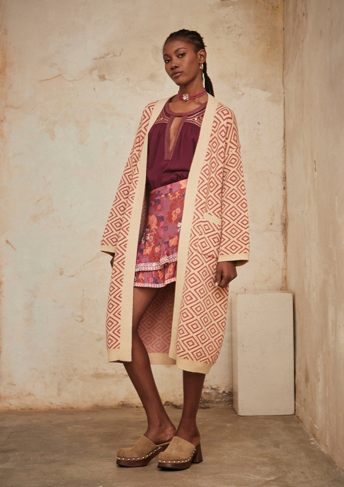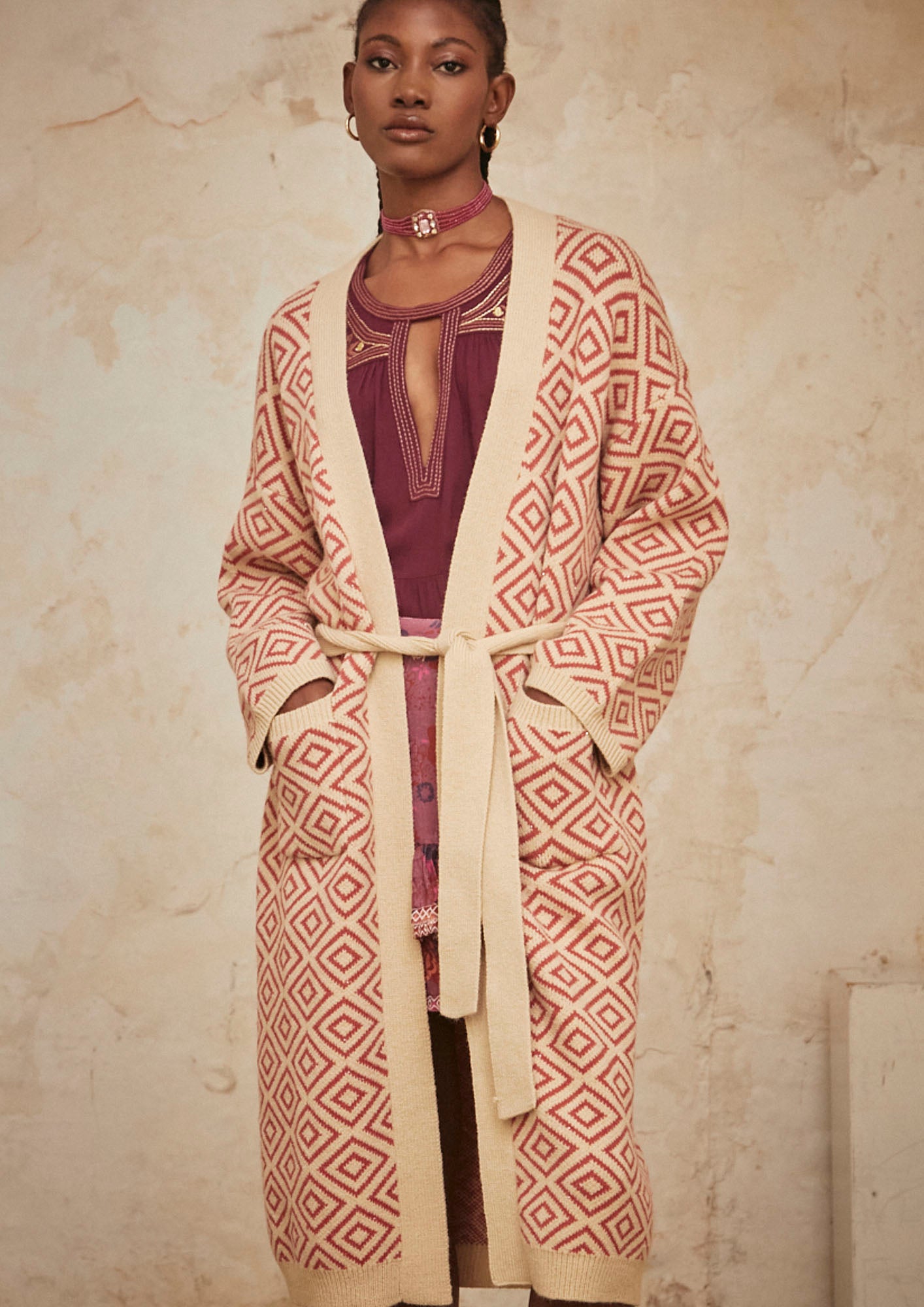 Long-sleeved kimono in two-tone geometric jacquard - brick