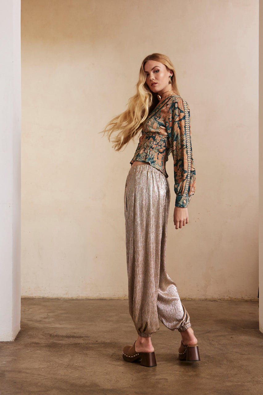FLUID PLEATED PANTS WITH GLOSSY QUALITY - SILVER