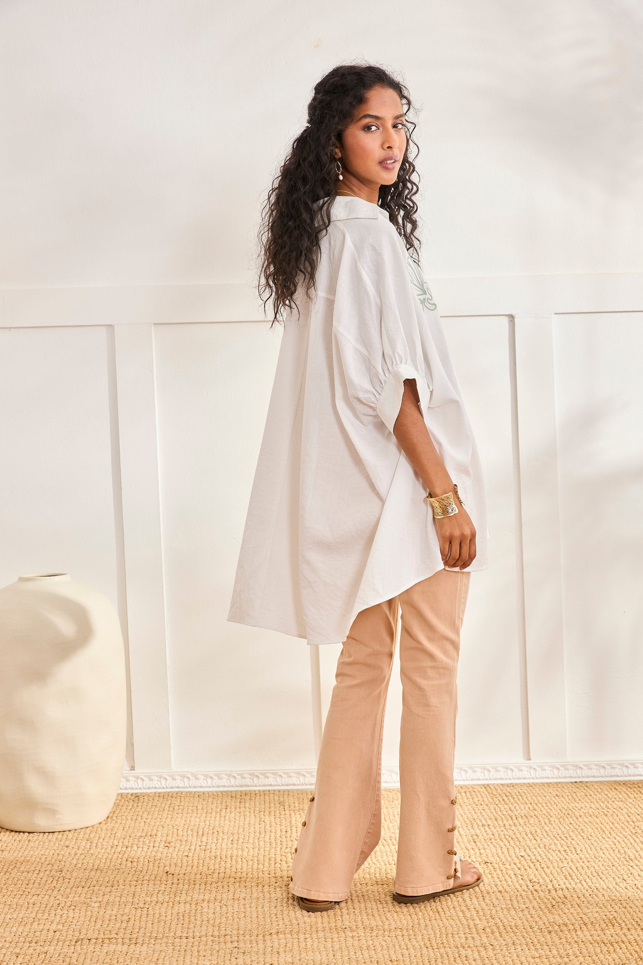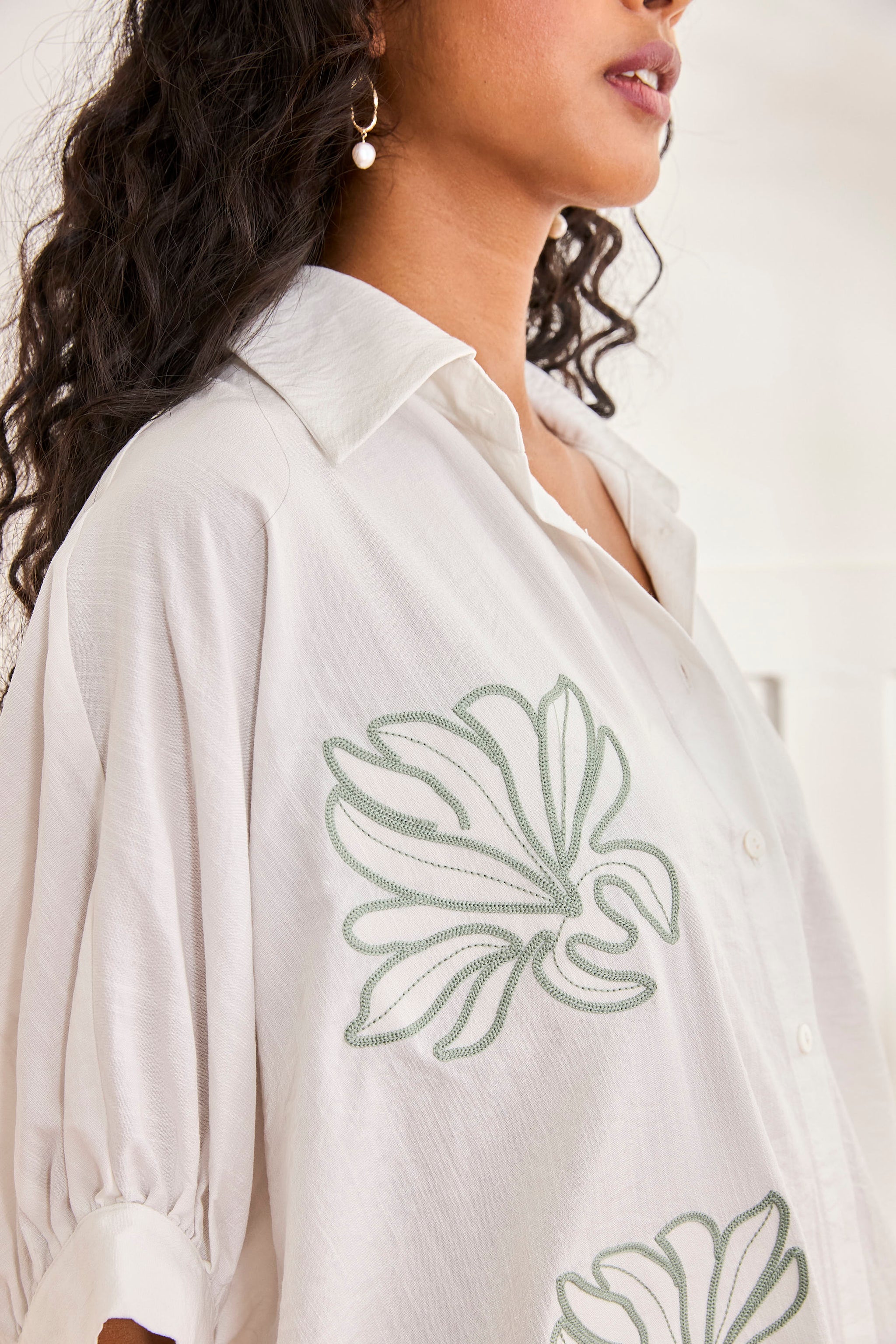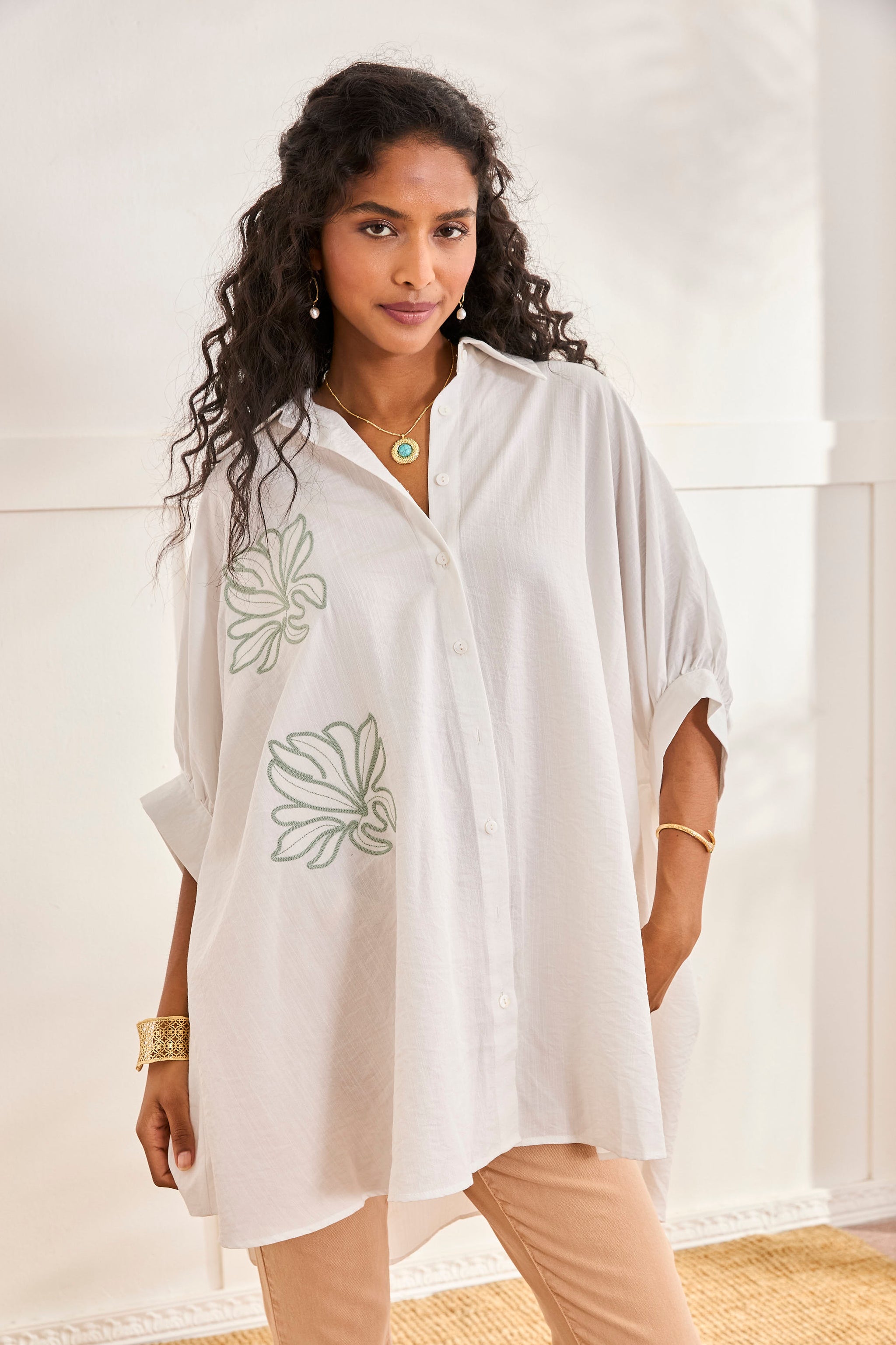 Shirt blouse with full button front. Floral embroidery detail. 3/4 length dropped sleeves with cuffs.