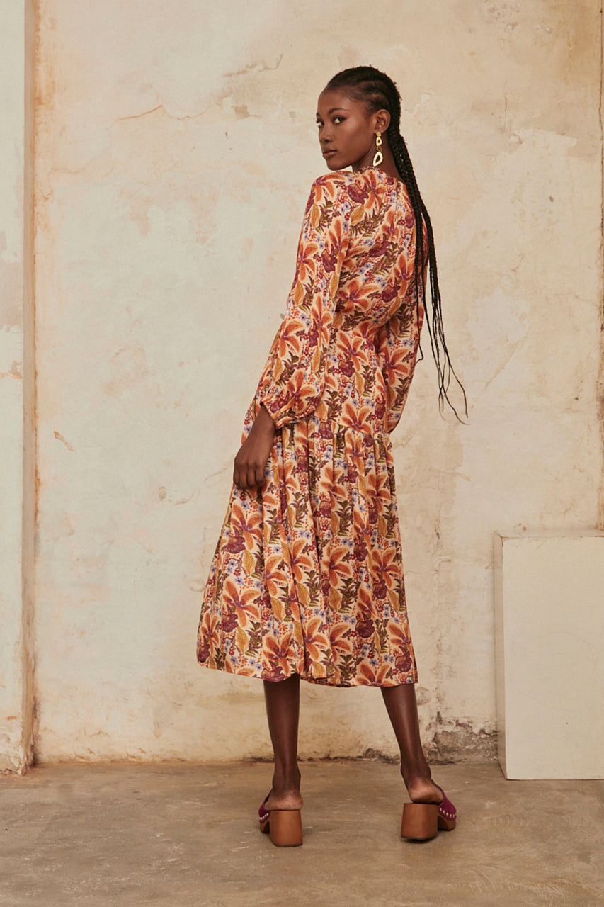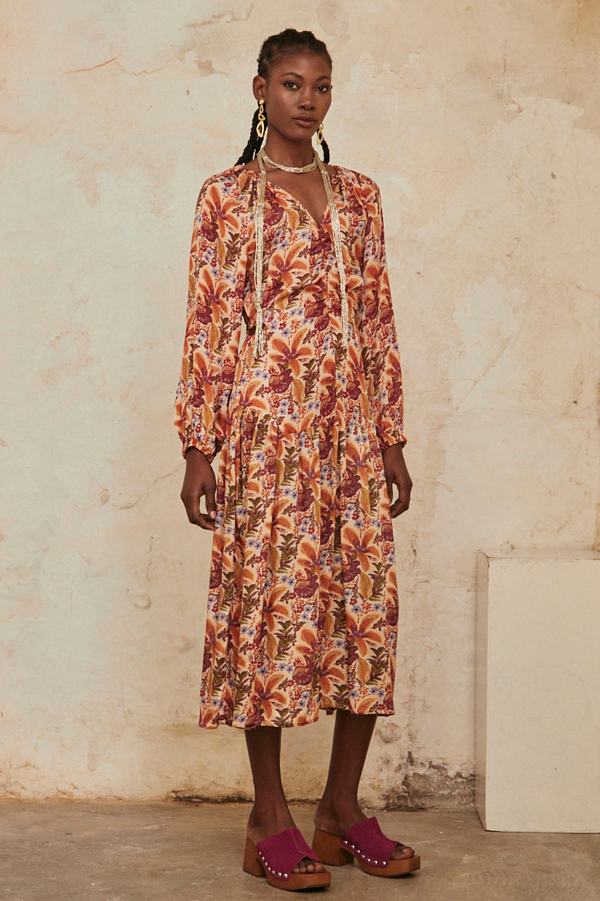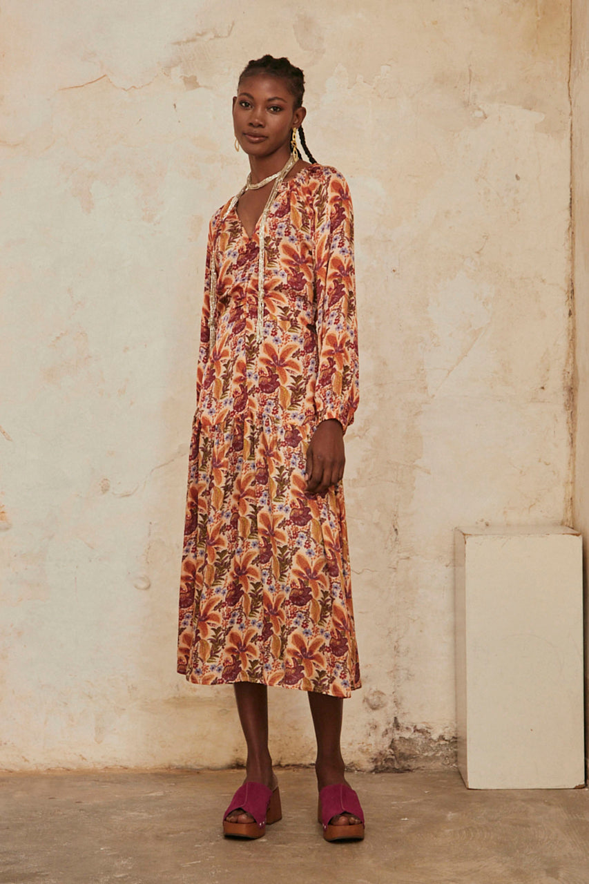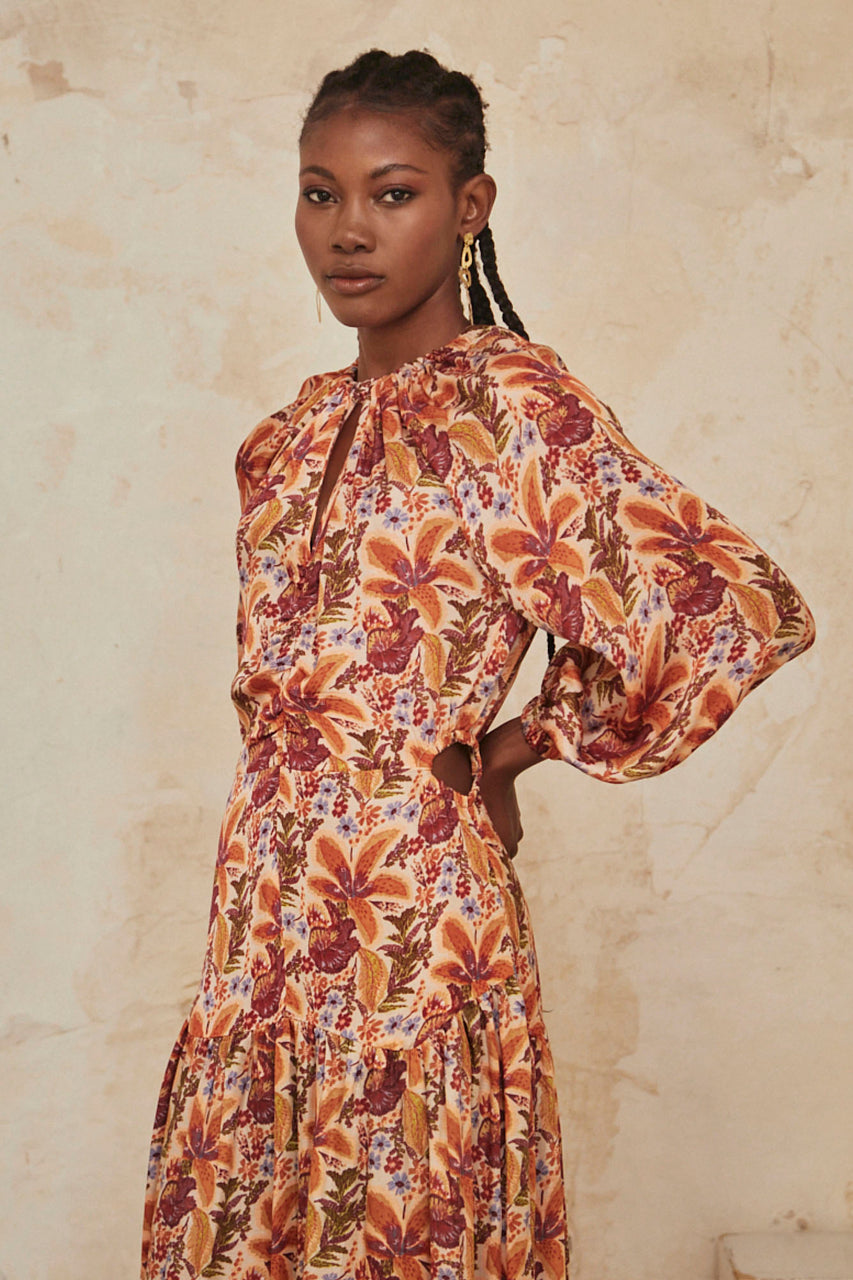 Long-sleeved floral print dress with a cutout waist and a round neckline with a teardrop neckline.