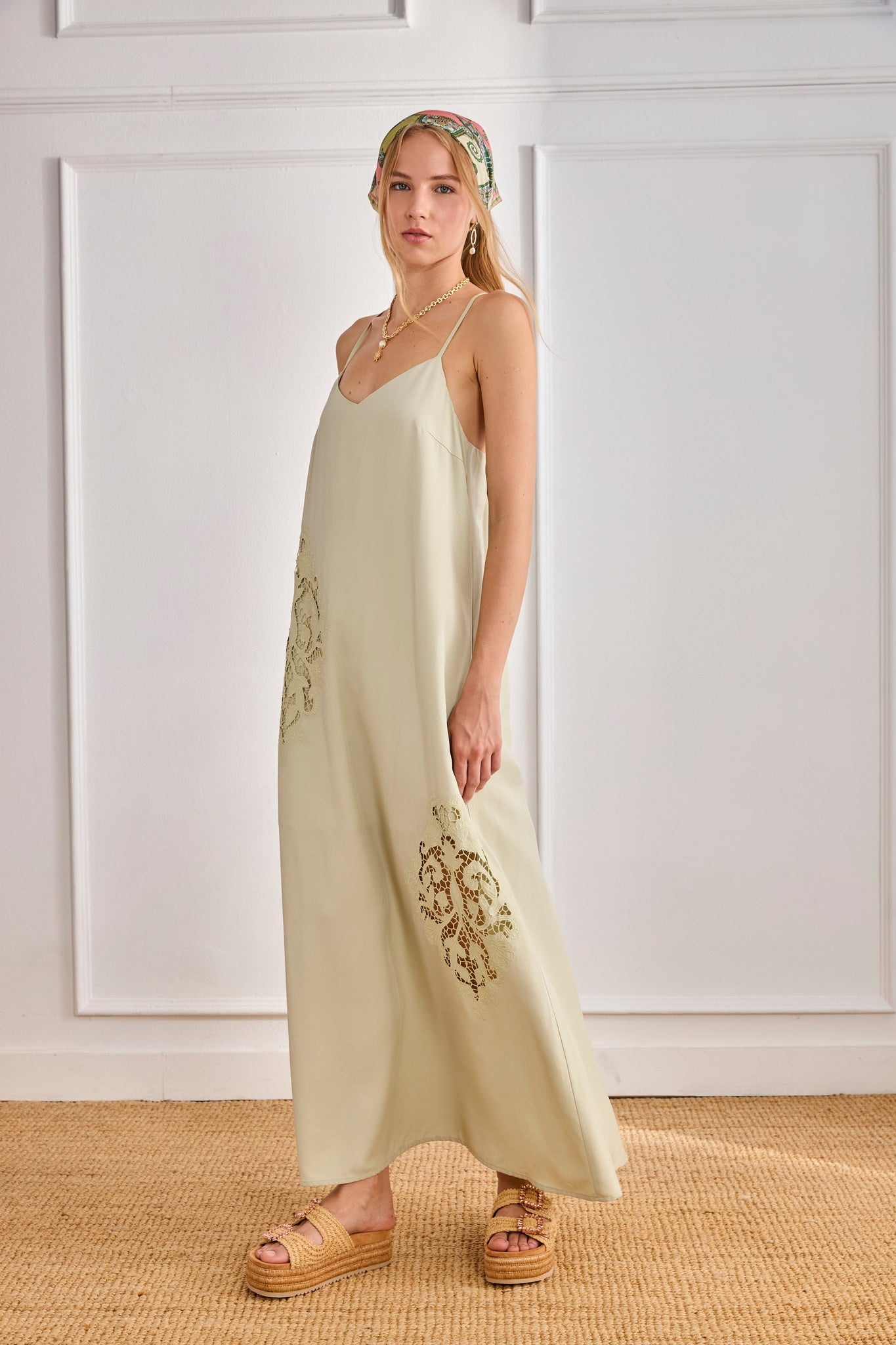 Long slip dress with a V-neck and thin straps that cross at the back. Features openwork floral details on the sides.