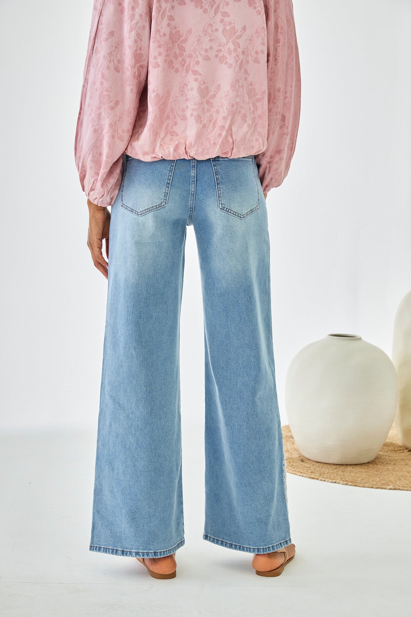 Long denim trousers with subtle faded washes. Features silver-tone studs in a mandala pattern. Front and back pockets. Button and zip fastening.