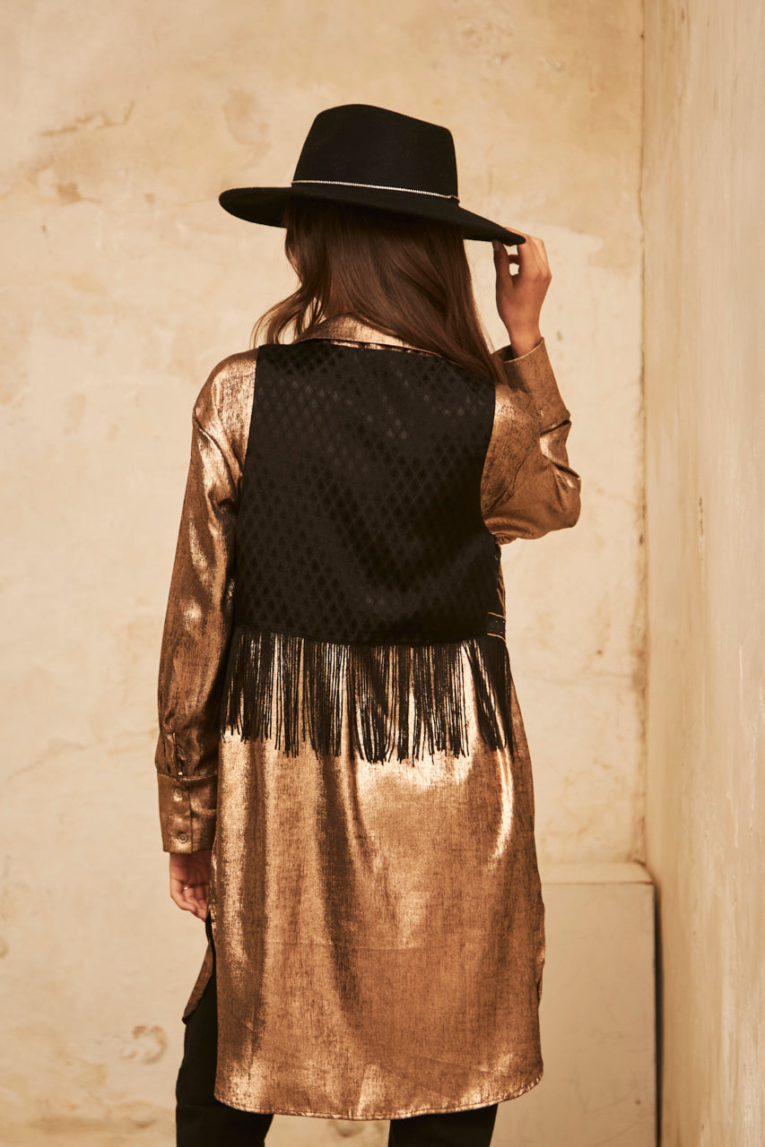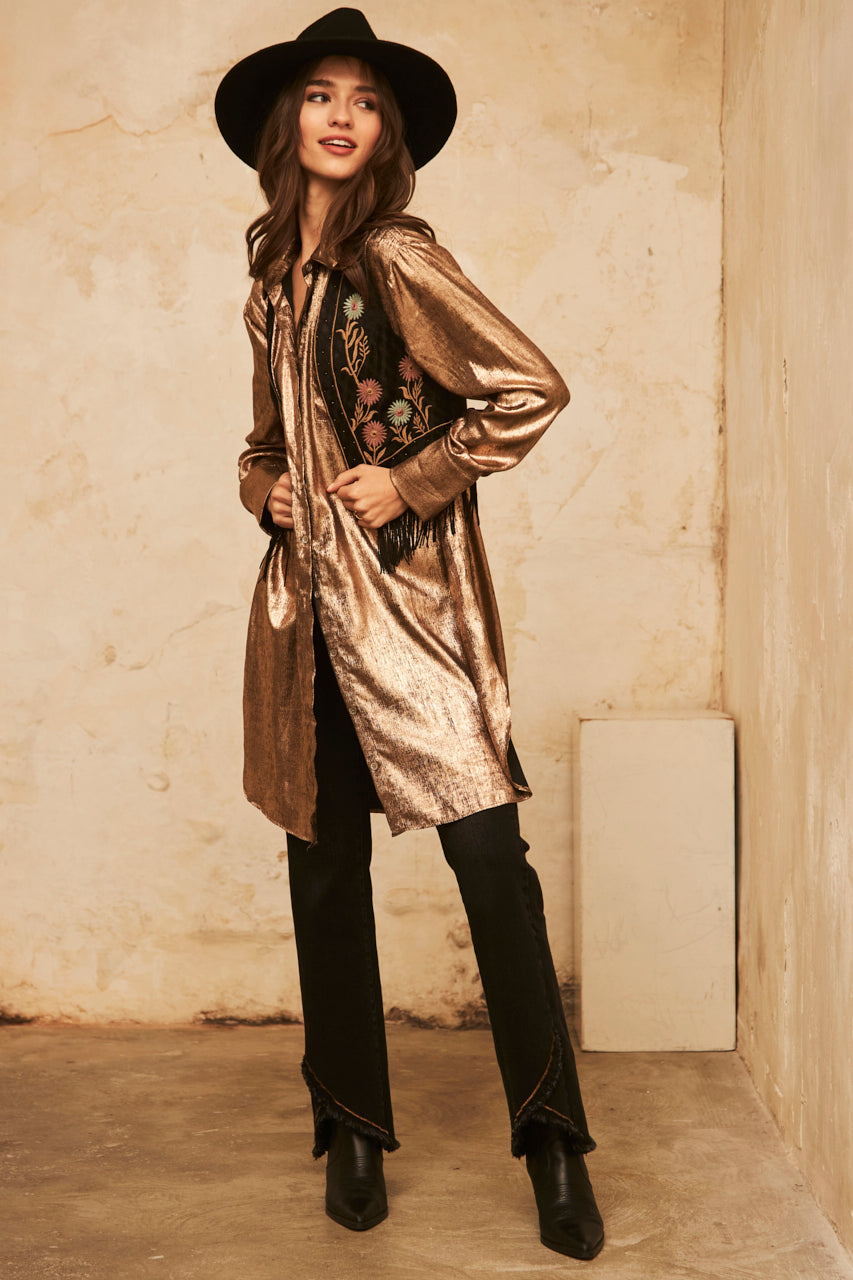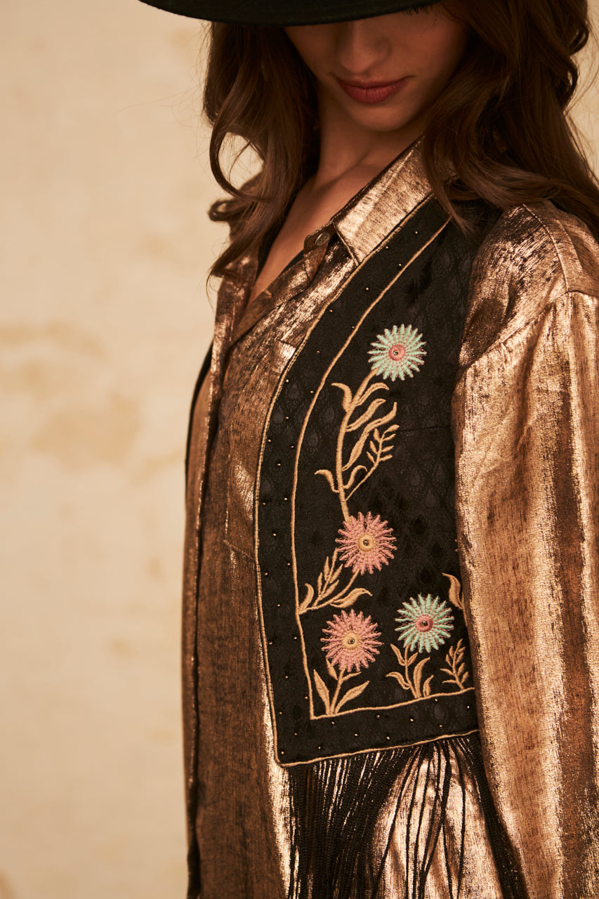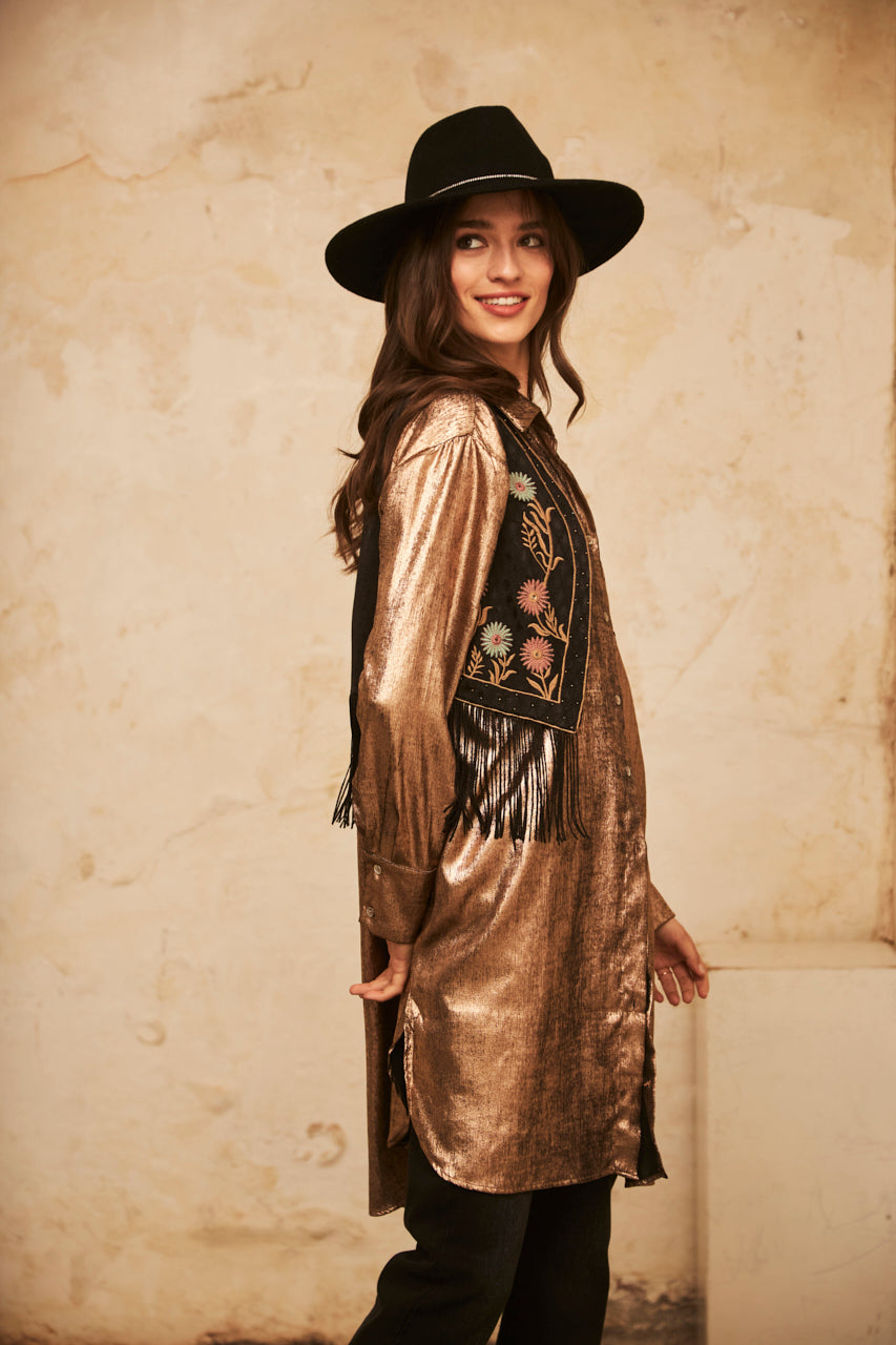 Vest with floral embroidery and rhinestones. Fringed hem.