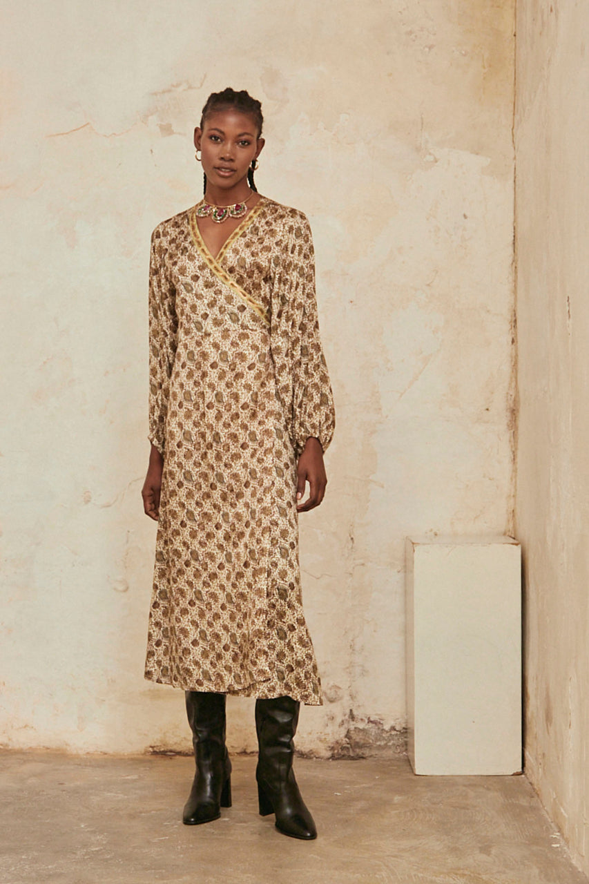 Long Sleeve Wrap Dress with Embroidery and Print - Green