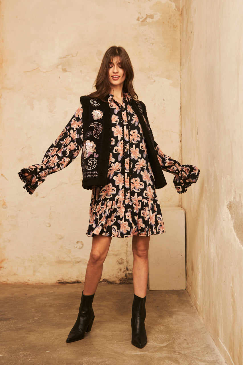 SHORT PRINTED LONG-SLEEVED DRESS - BLACK