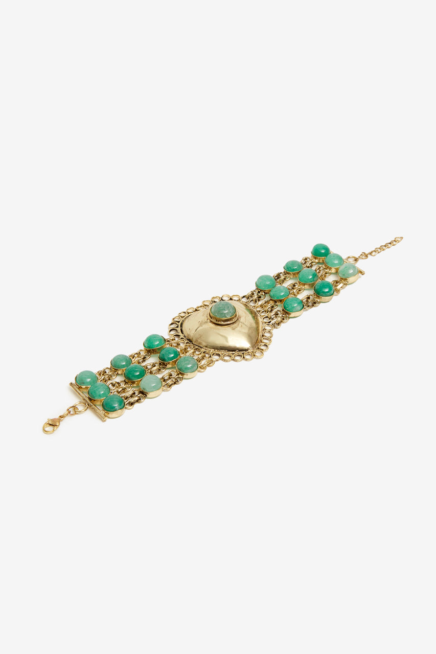 Heart-shaped medallion bracelet with natural stones. Lobster clasp closure.