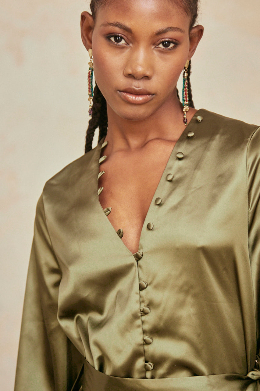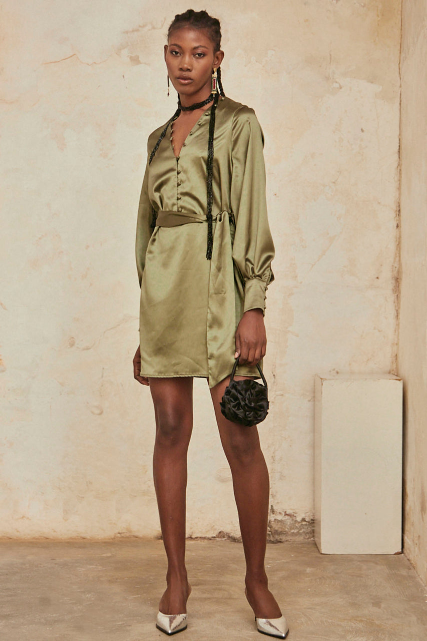 Short satin dress with long sleeves. Covered button detailing at the neckline and cuffs. Matching bow.