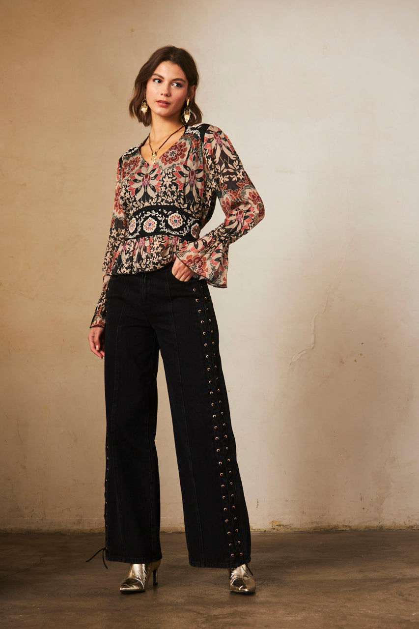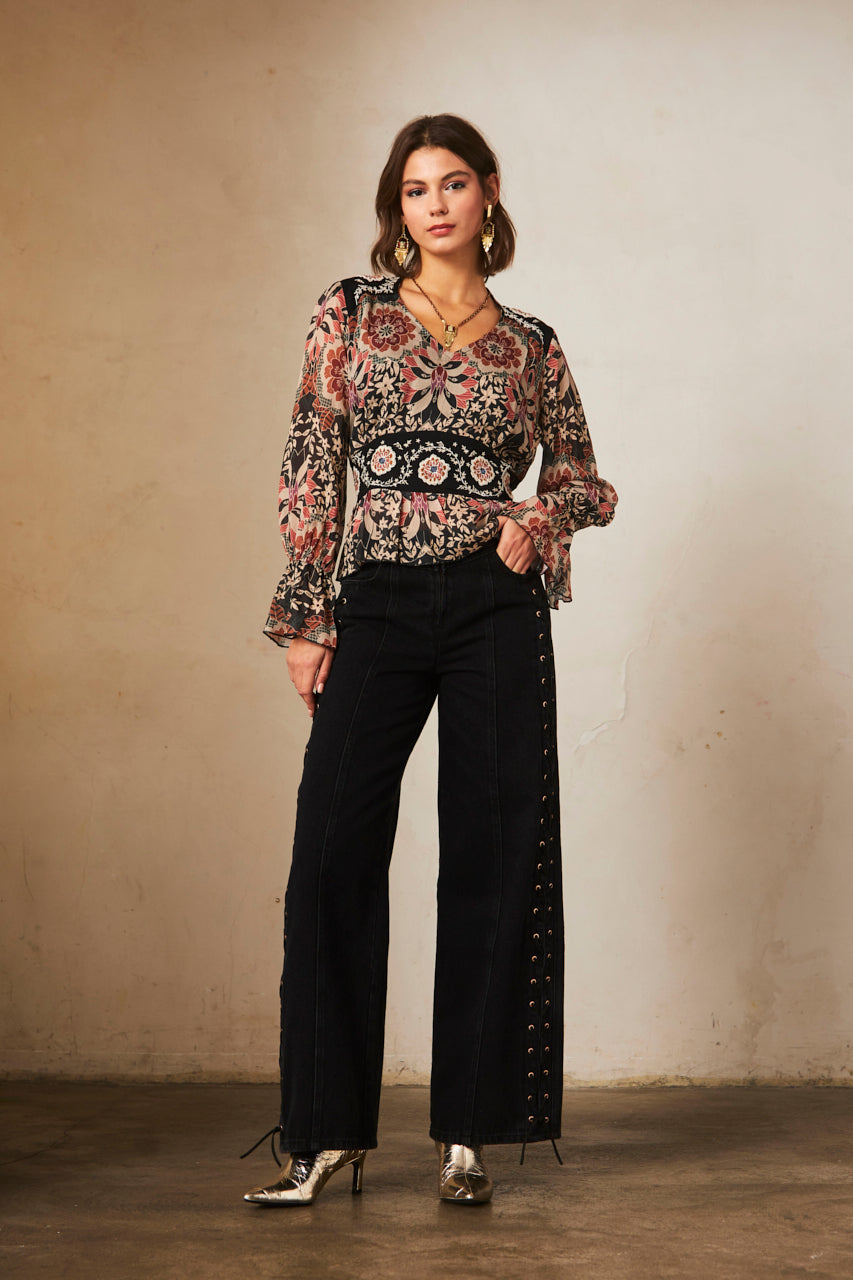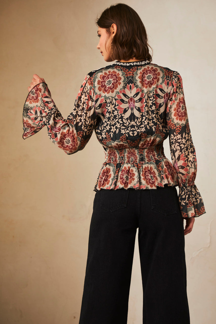 Floral print long-sleeved blouse. Elastic waist. Embroidery at the waist and shoulders. Flowy sleeves with elastic trim. V-neckline.