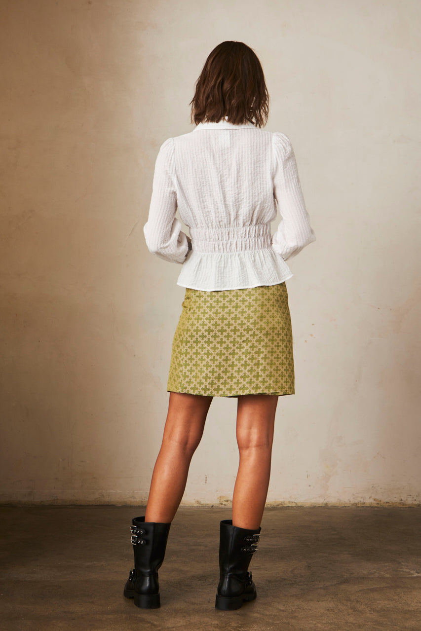 Long-sleeved, gathered, fitted blouse. Shirt collar. Button closure.