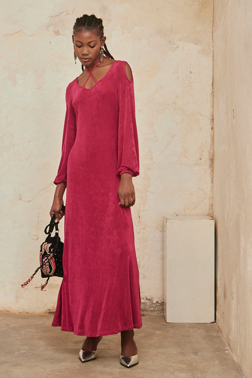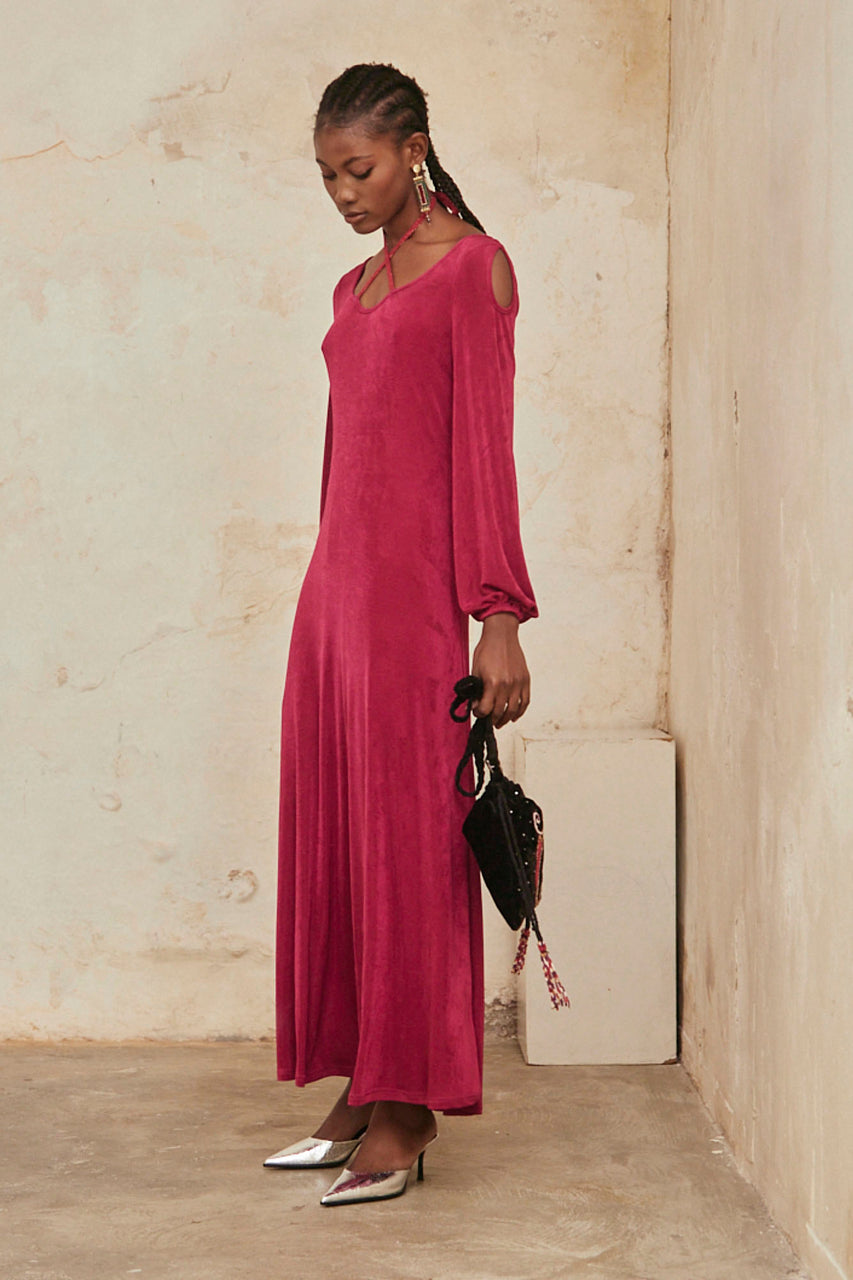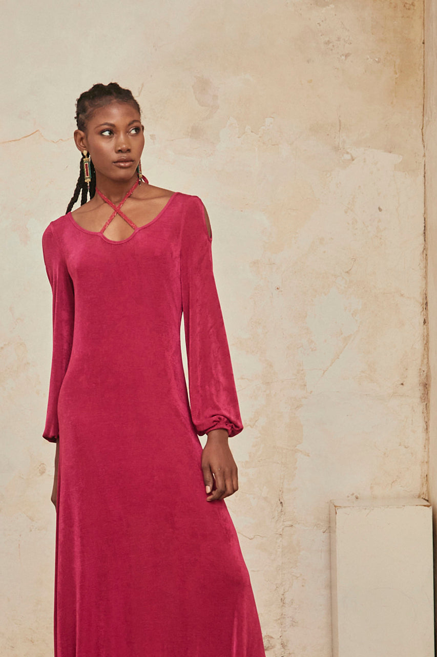 Long fitted knit dress with lurex and long sleeves - fuchsia