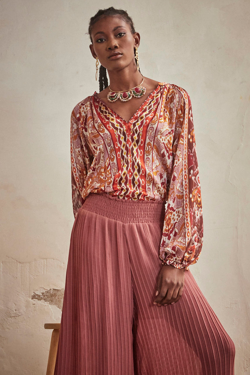 Long-sleeved blouse with a mixed print. Beaded V-neckline. Flowy long sleeves with a stretchy finish.