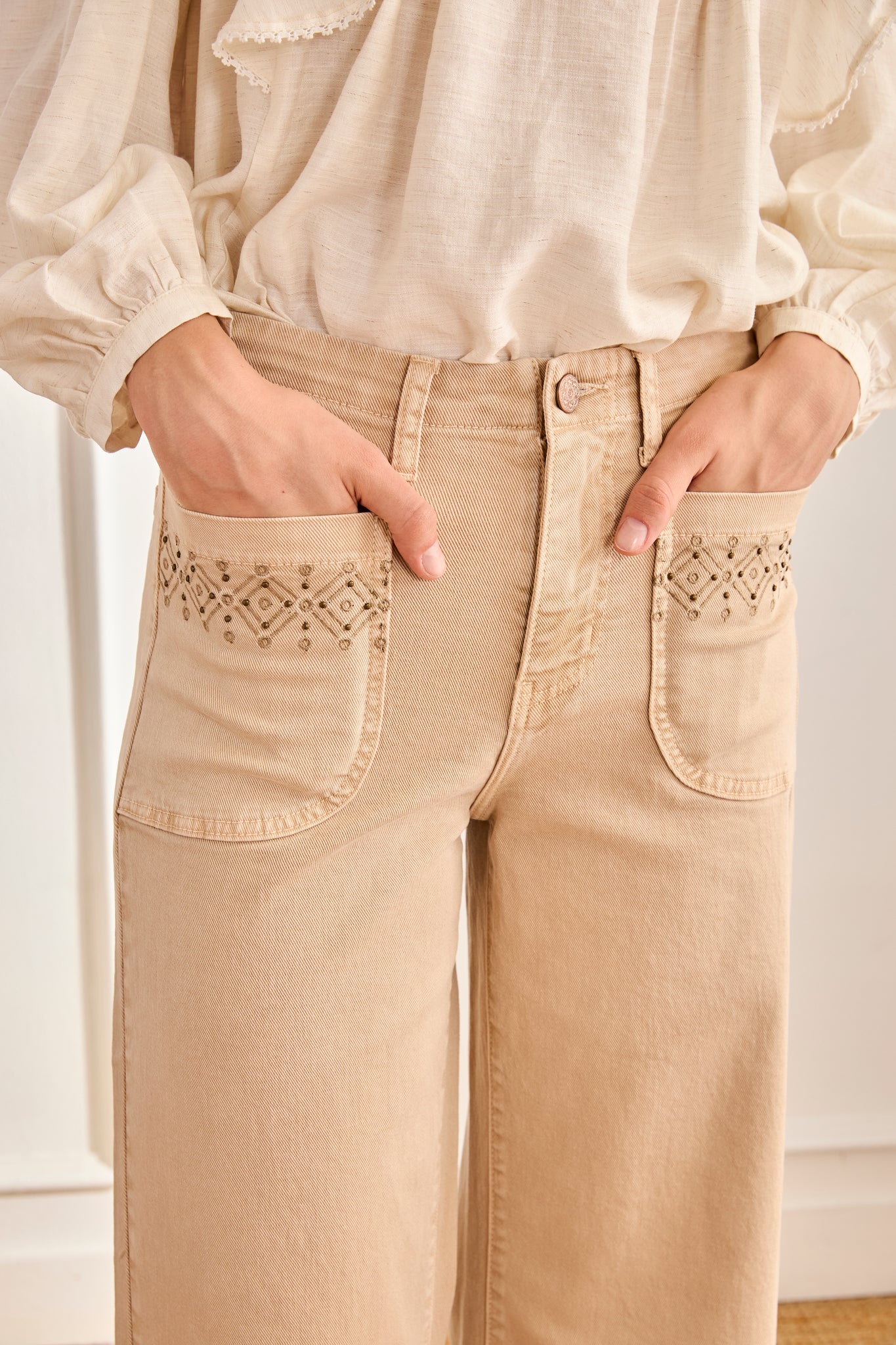 Retro-style long trousers in plain denim. Front and back pockets. Embroidered trim and stud details on the front pockets and flared hems with side slits. Button and zip fastening.