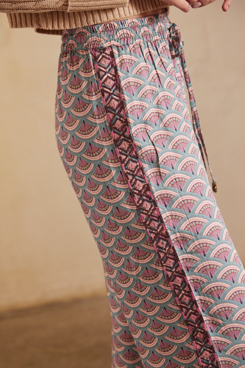 PRINTED FLUID STRAIGHT PANTS WITH EMBROIDERY - ROSE