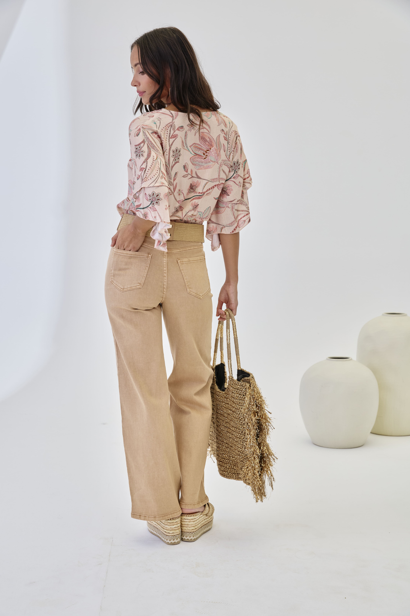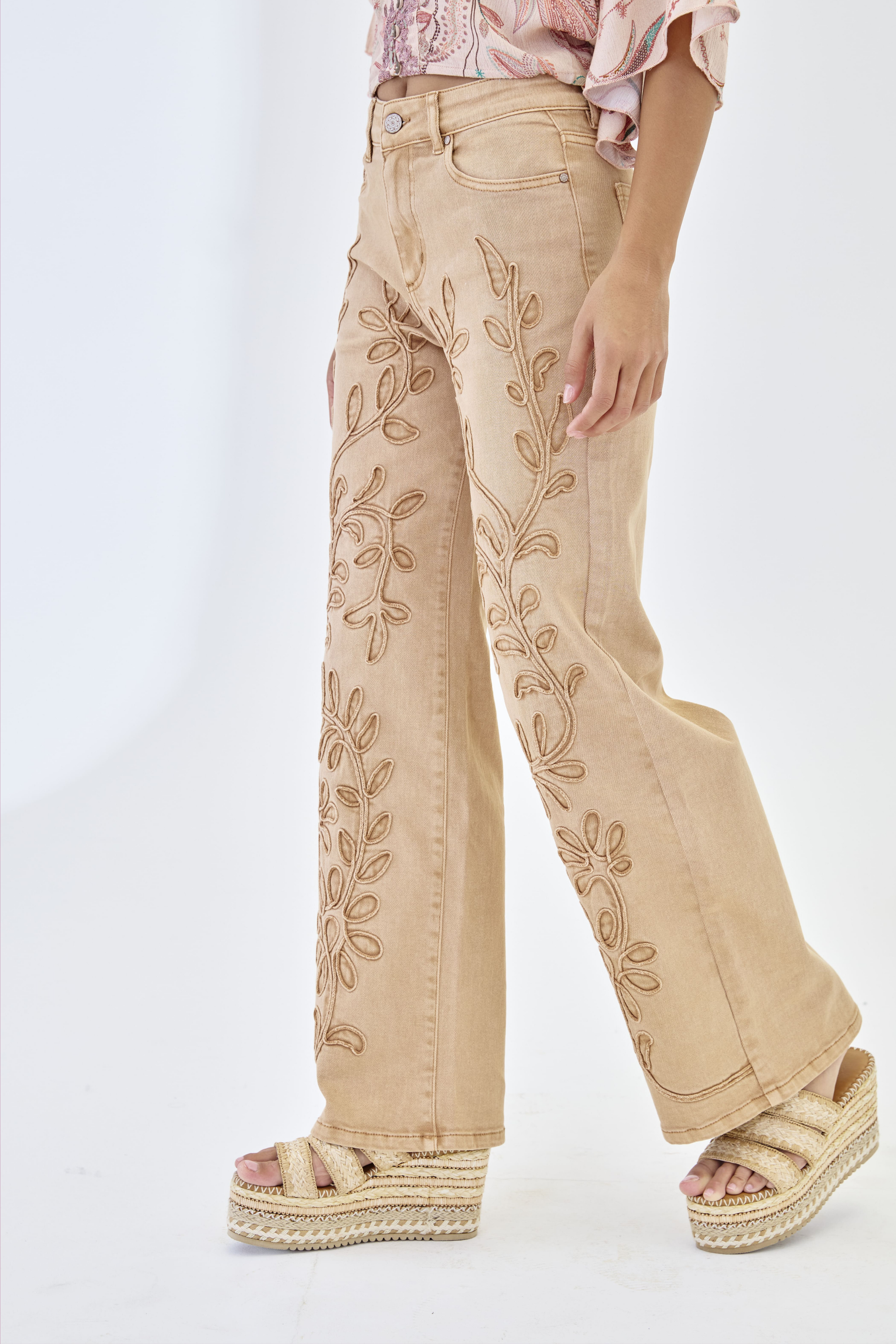 JEANS WITH EMBROIDERED LEAVES - CAMEL