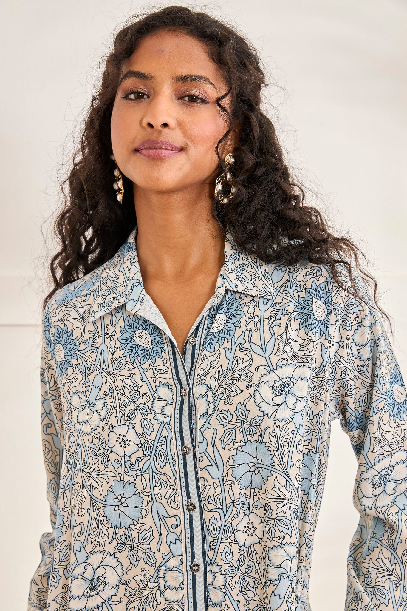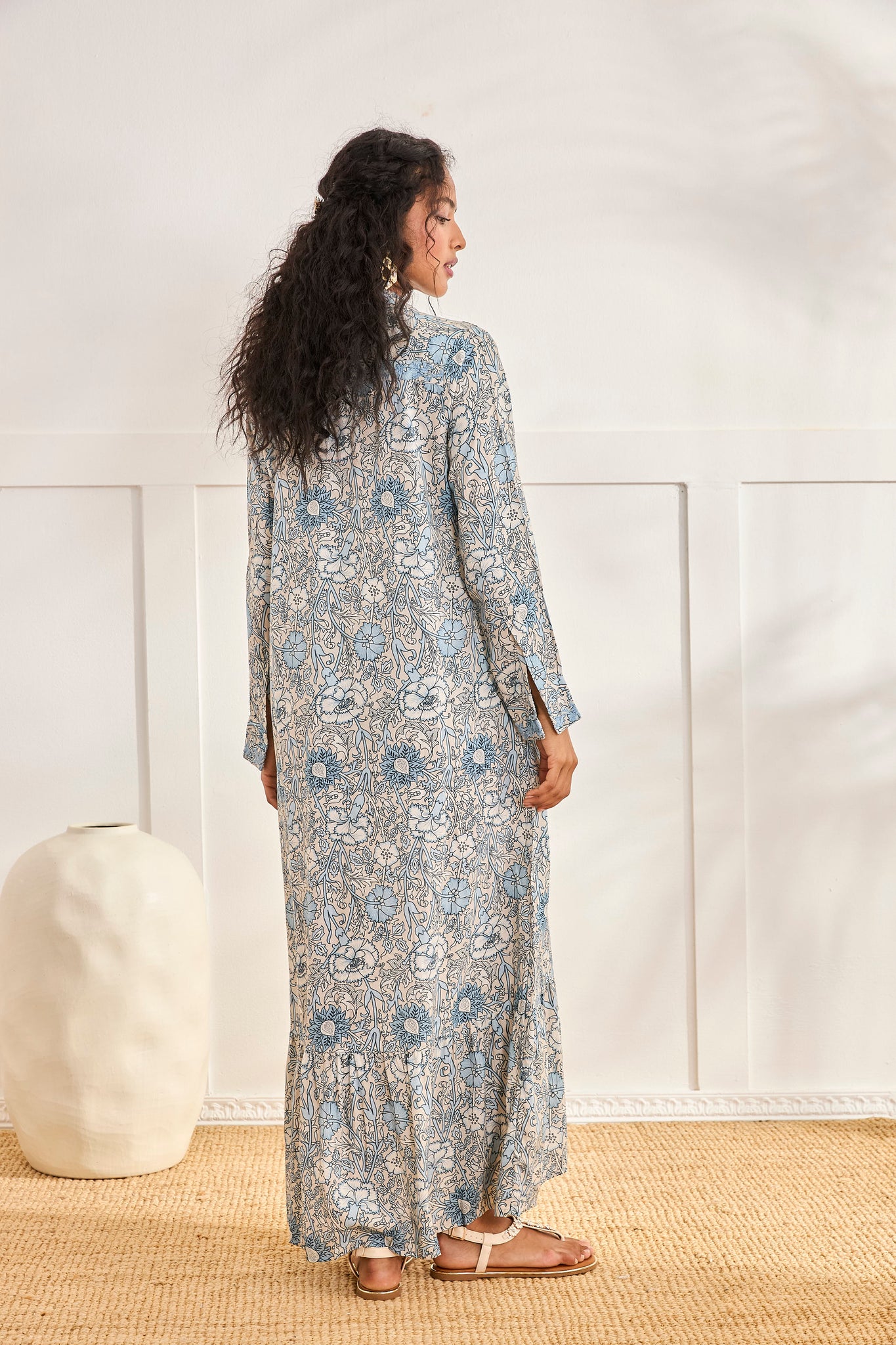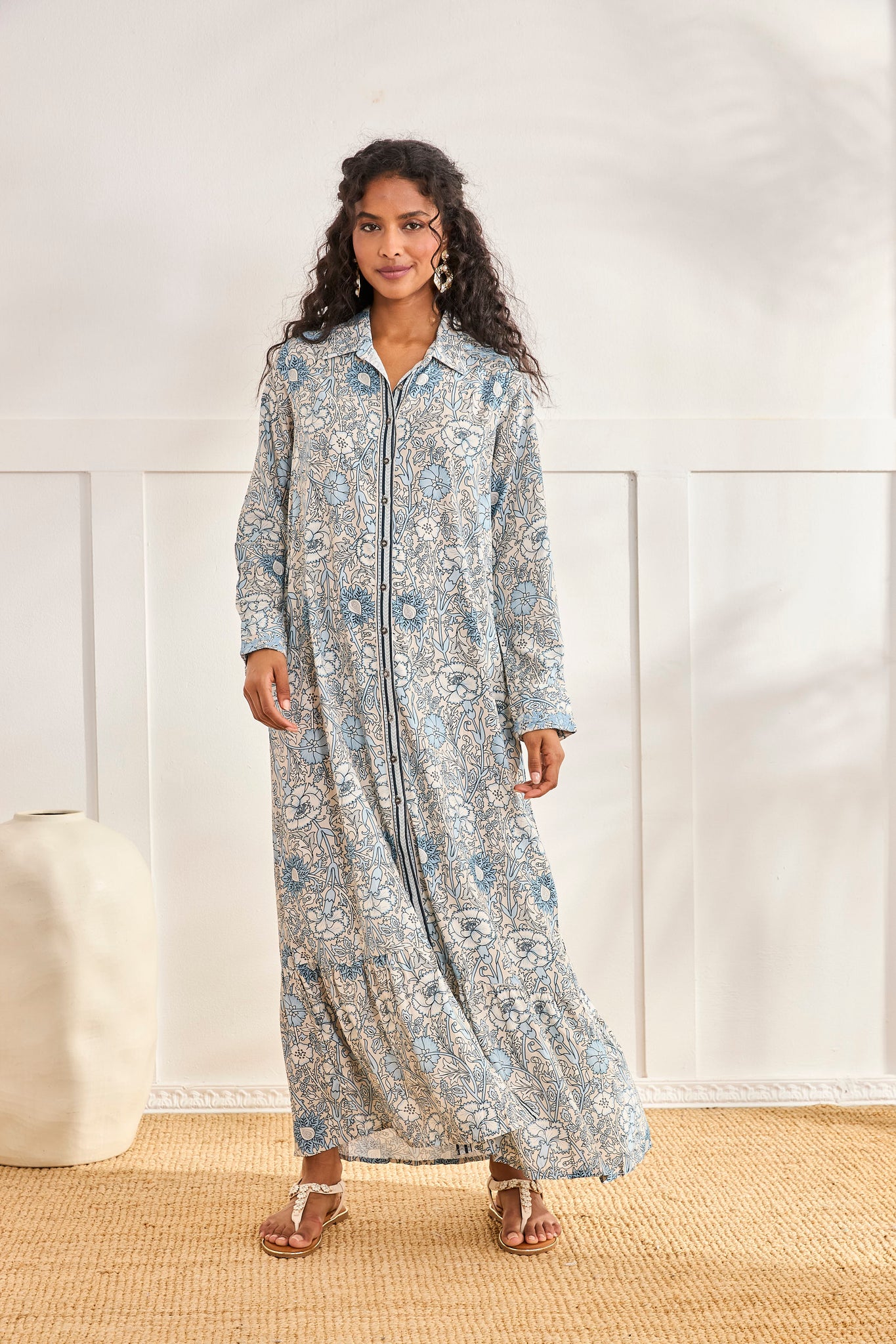 Long dress in a fine floral print fabric. Shirt collar and full button-down front with embroidered ribbon. Long sleeves with buttoned cuffs. Ruffled hem.