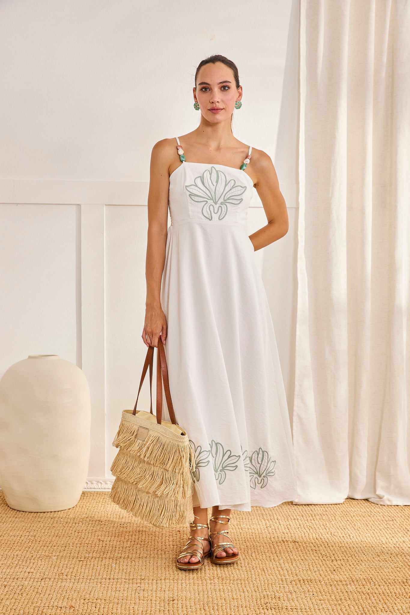 LONG DRESS WITH EMBROIDERED FLOWER - WHITE