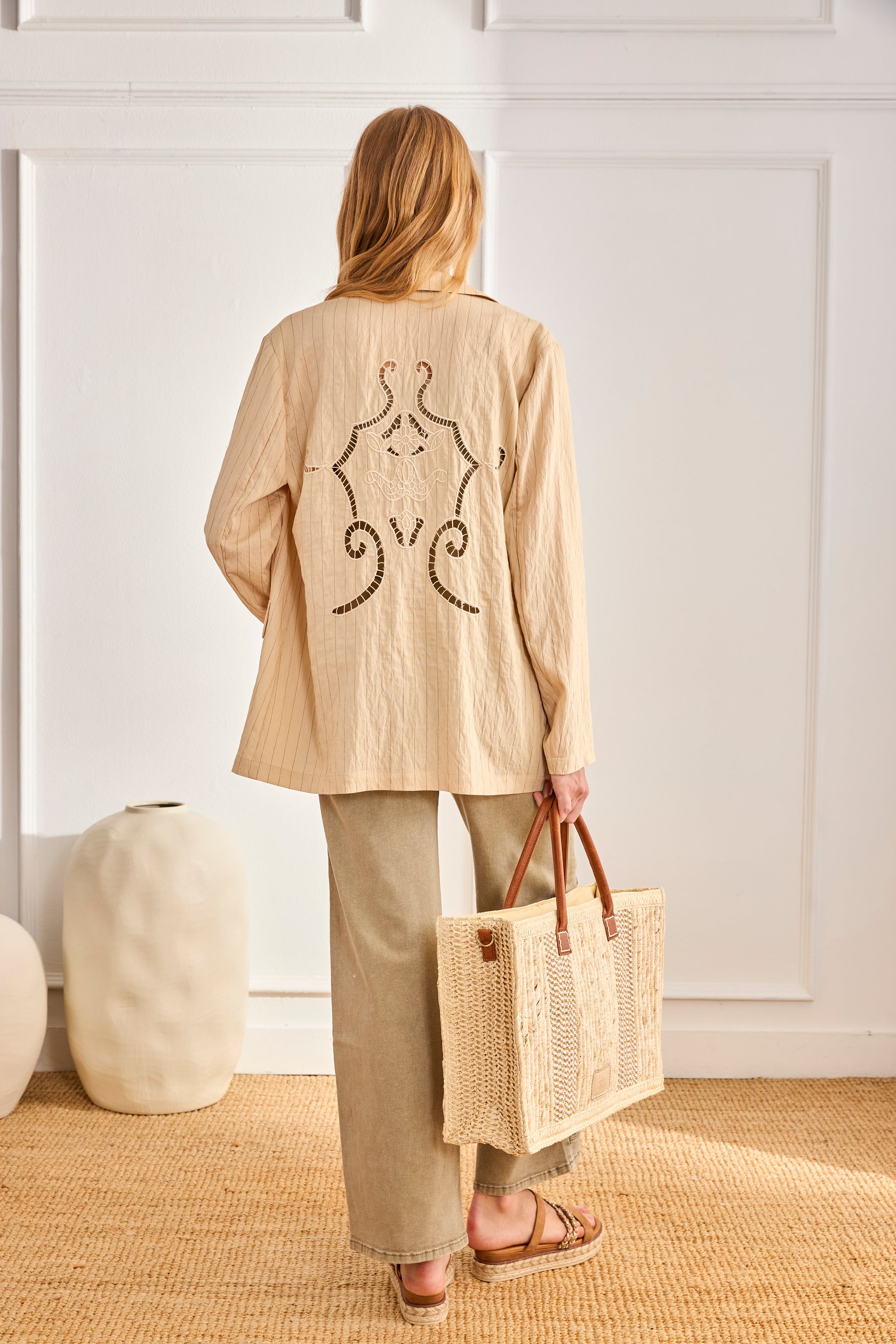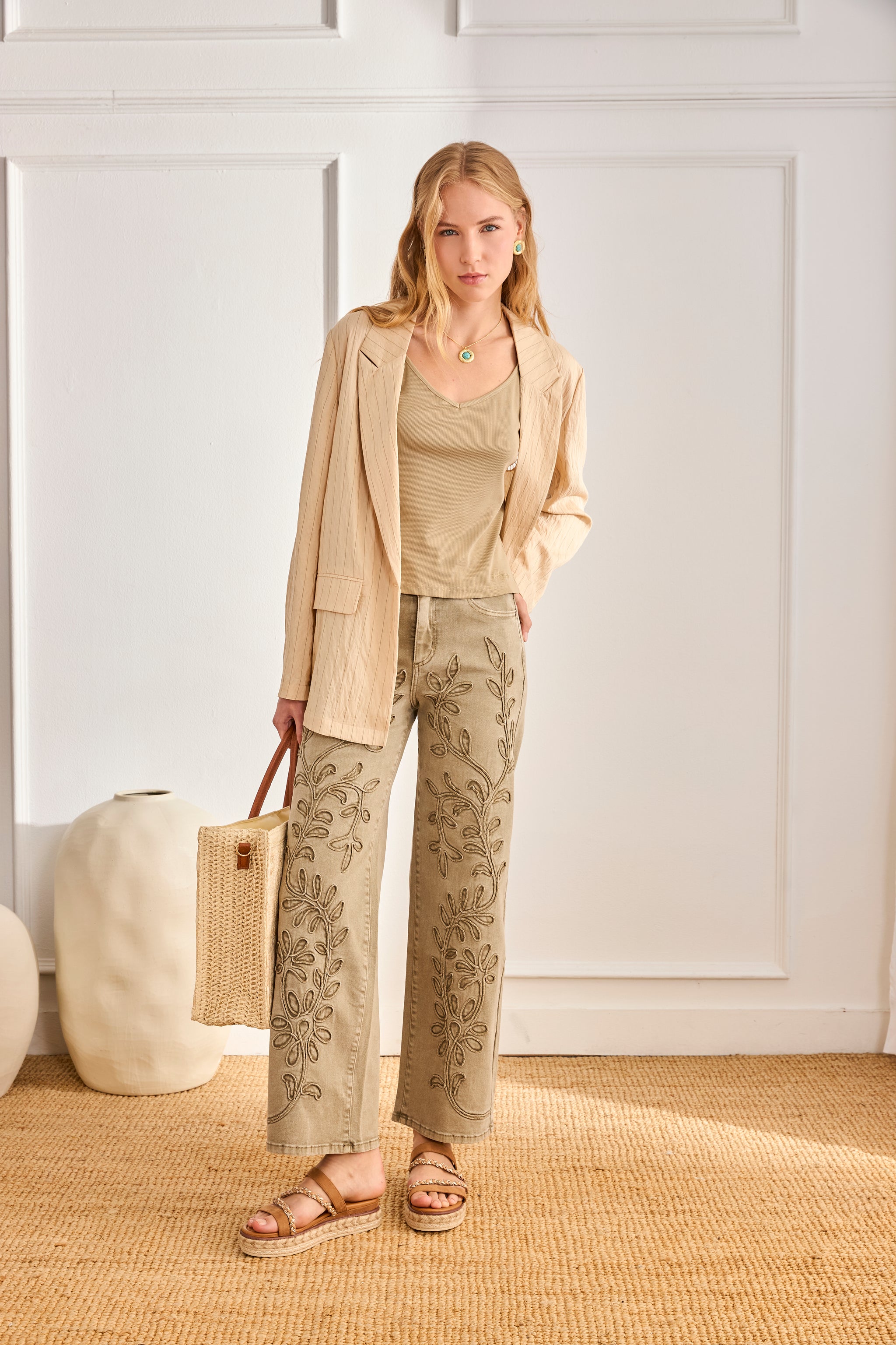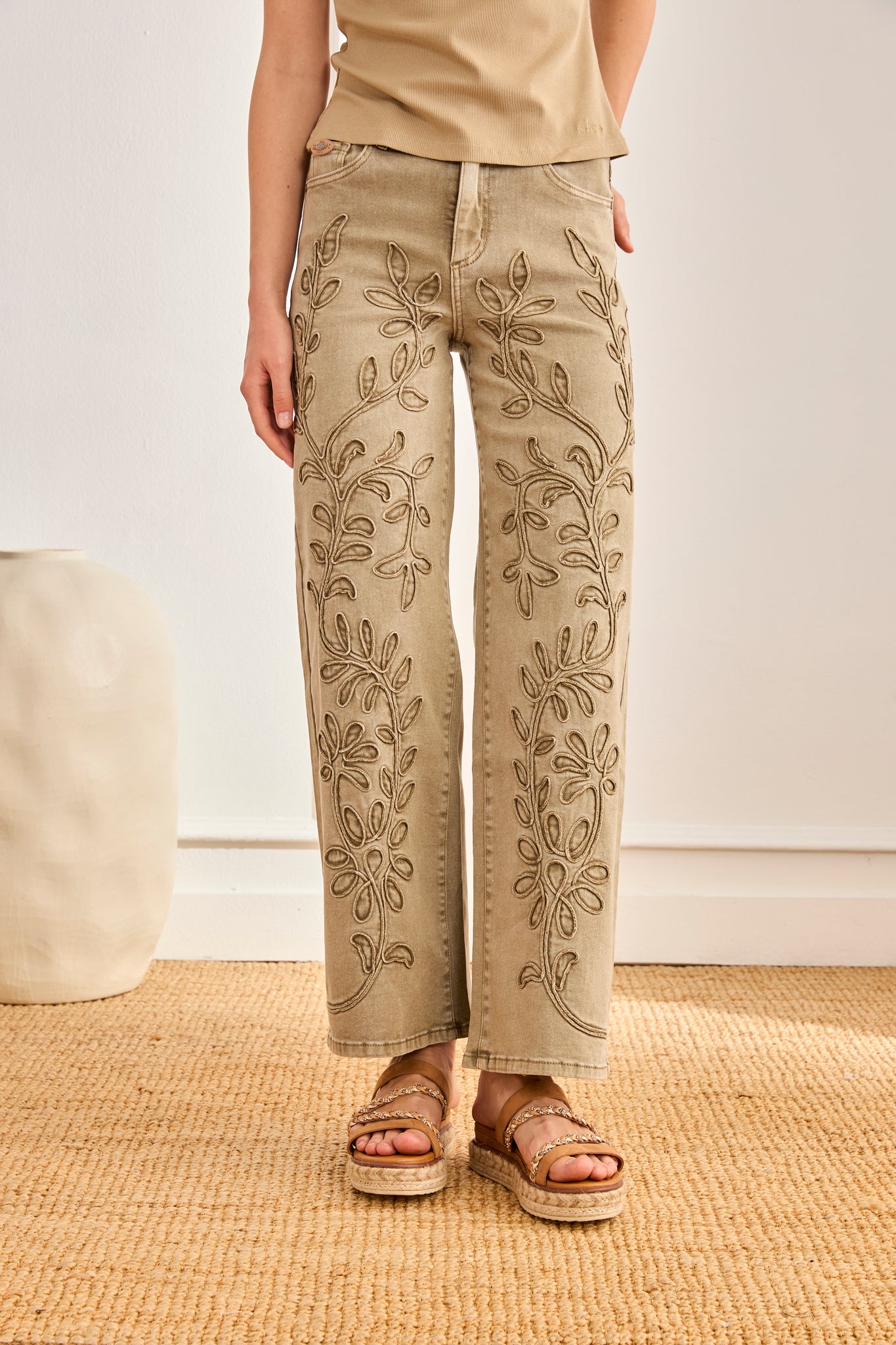 JEANS WITH EMBROIDERED LEAVES - KHAKI