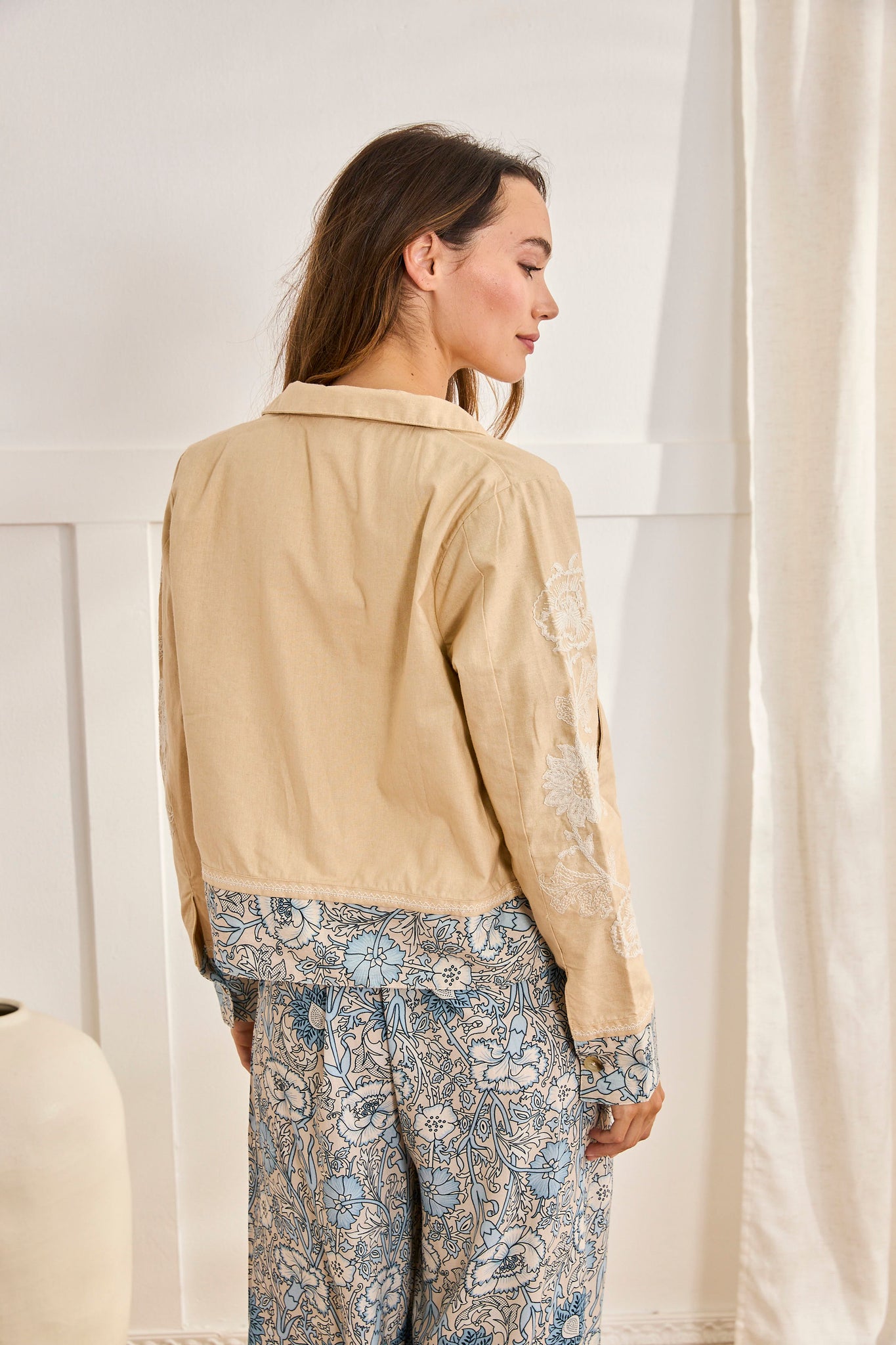 MIXED FLORAL FABRIC JACKET - CAMEL