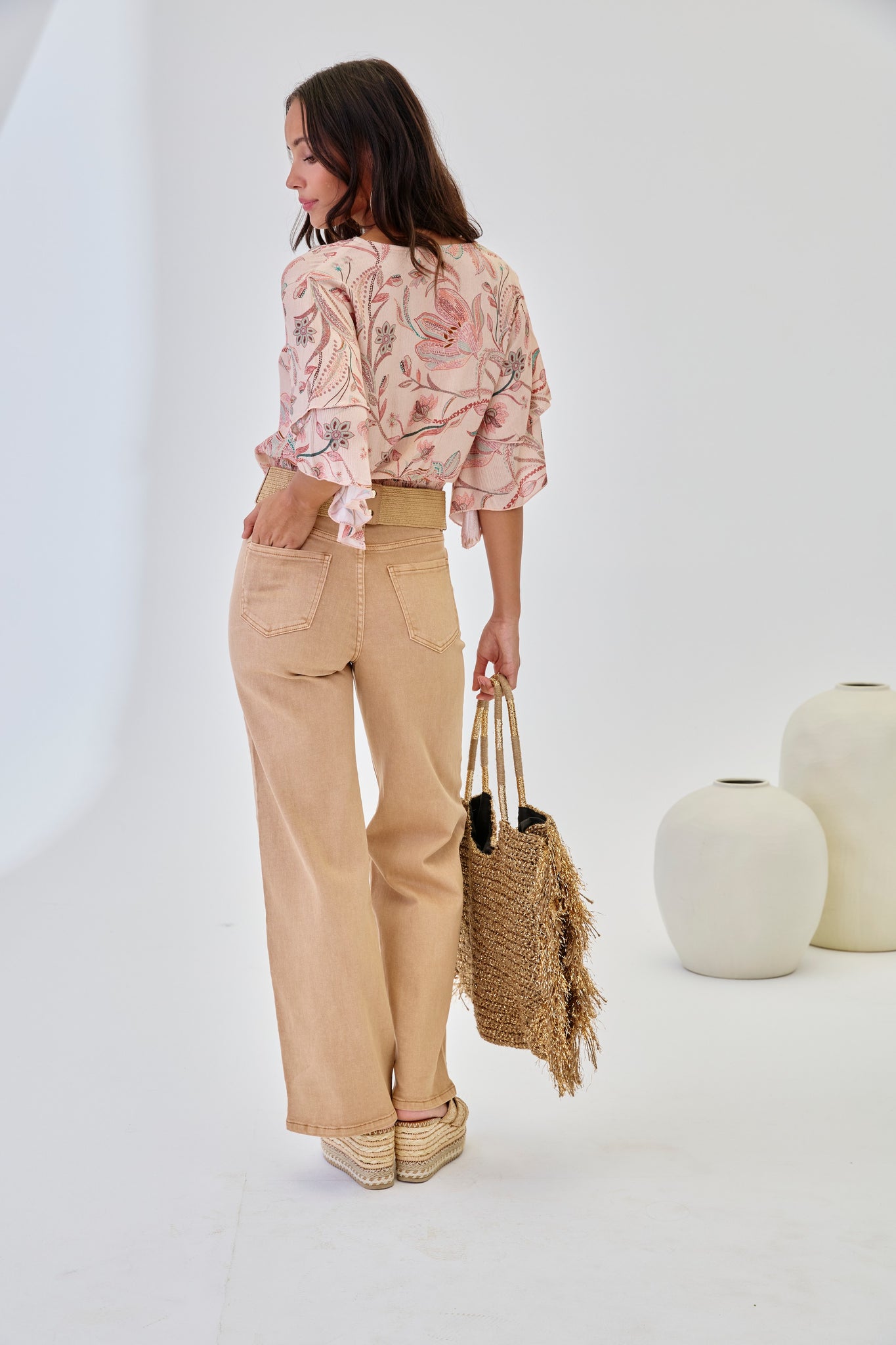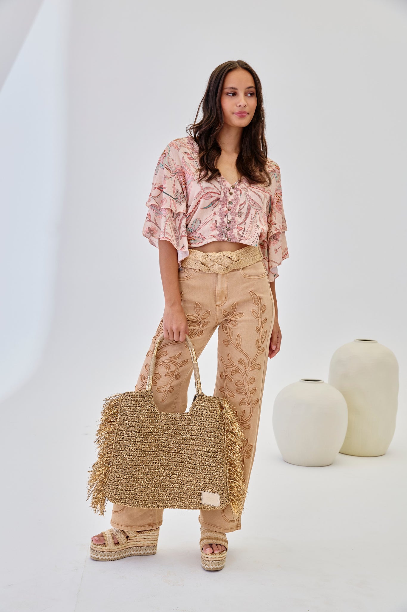 RUFFLED PRINTED CROPPED BLOUSE - PINK