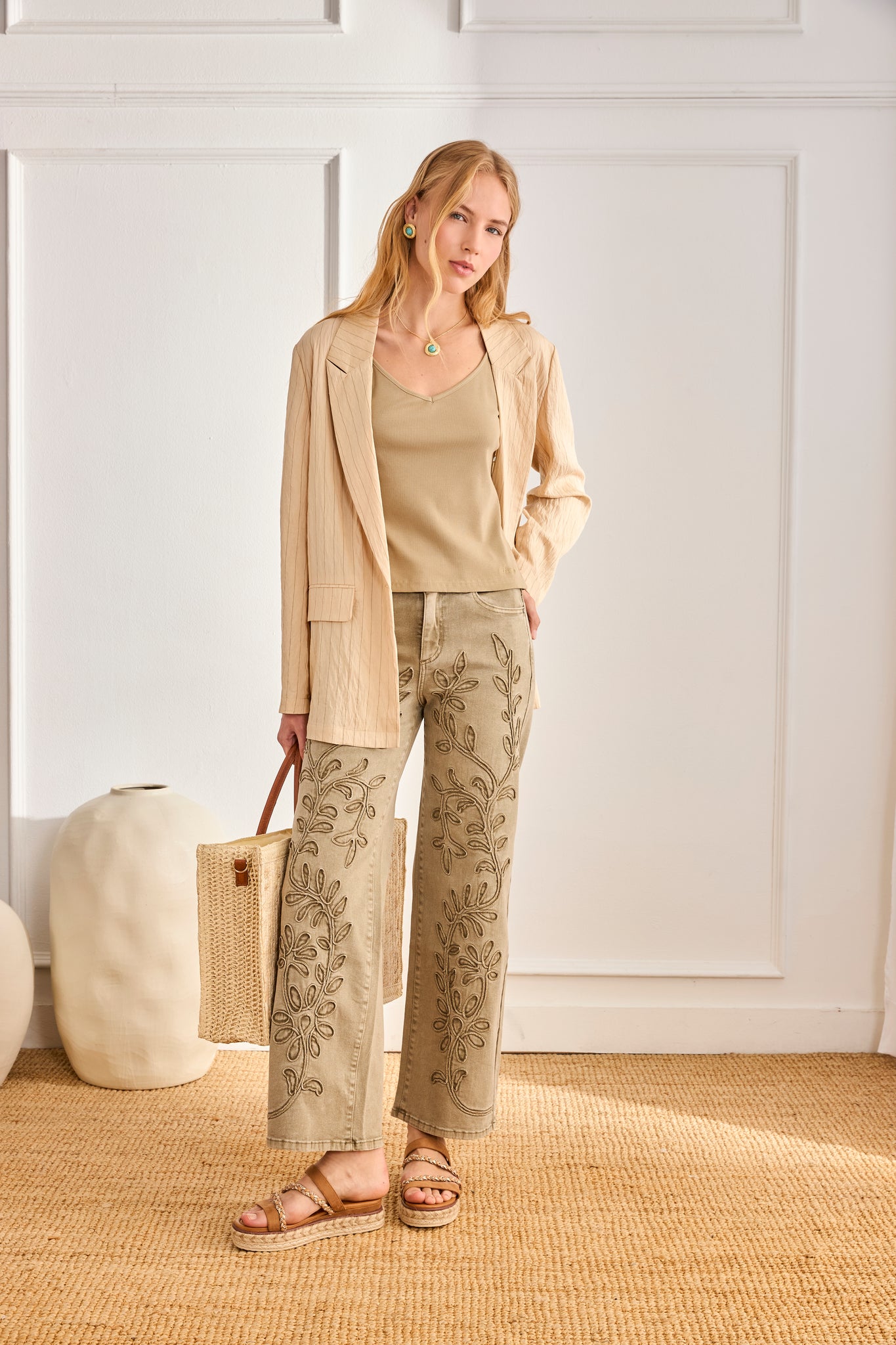 Striped print blazer jacket, unlined and with a single front button. Flap pockets. Floral openwork detail on the back finished with tonal thread.