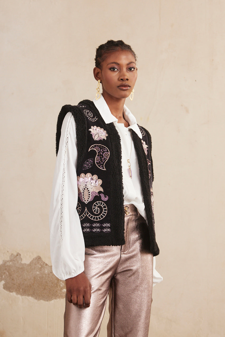 Chaleco bordado paisley con borreguillo.