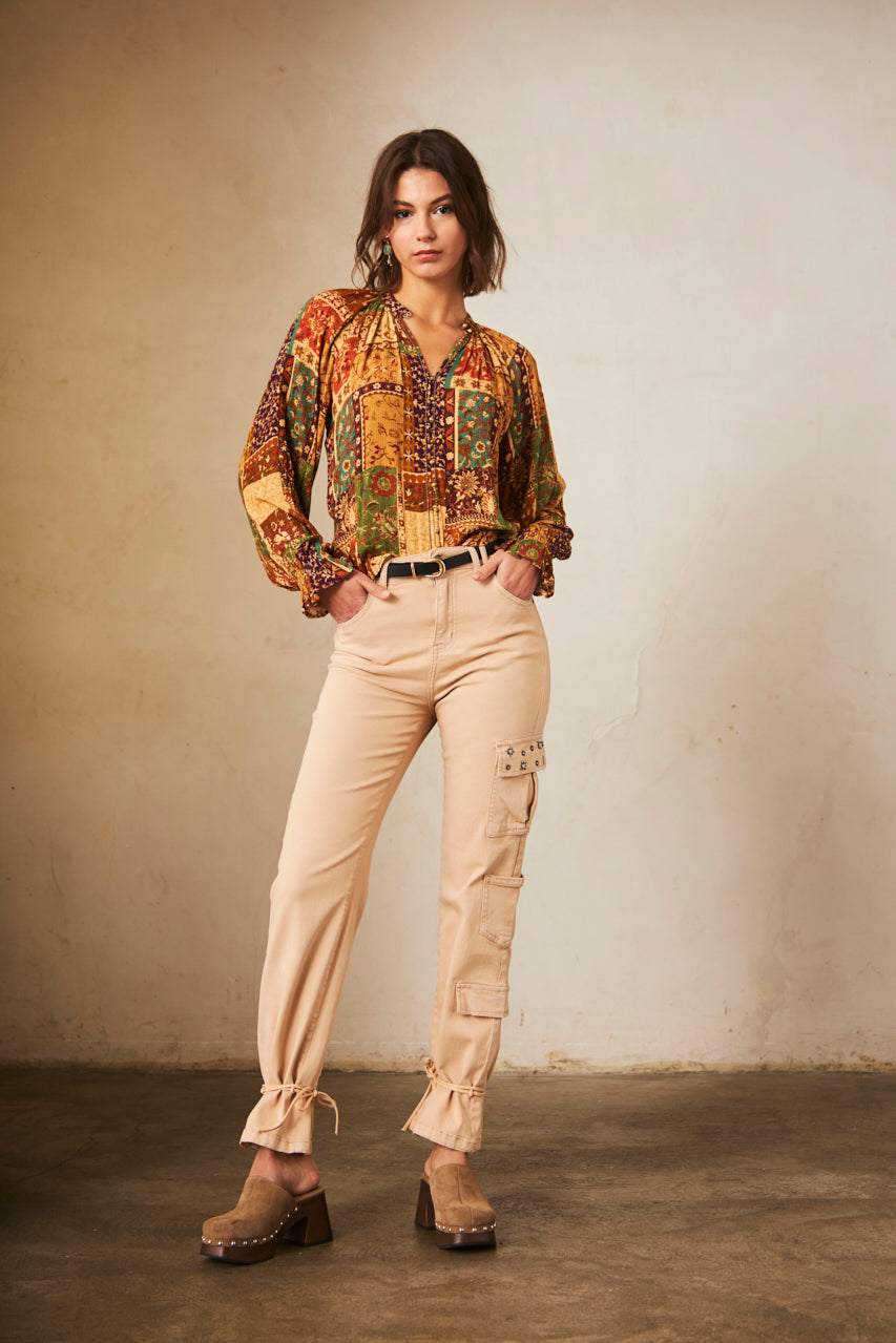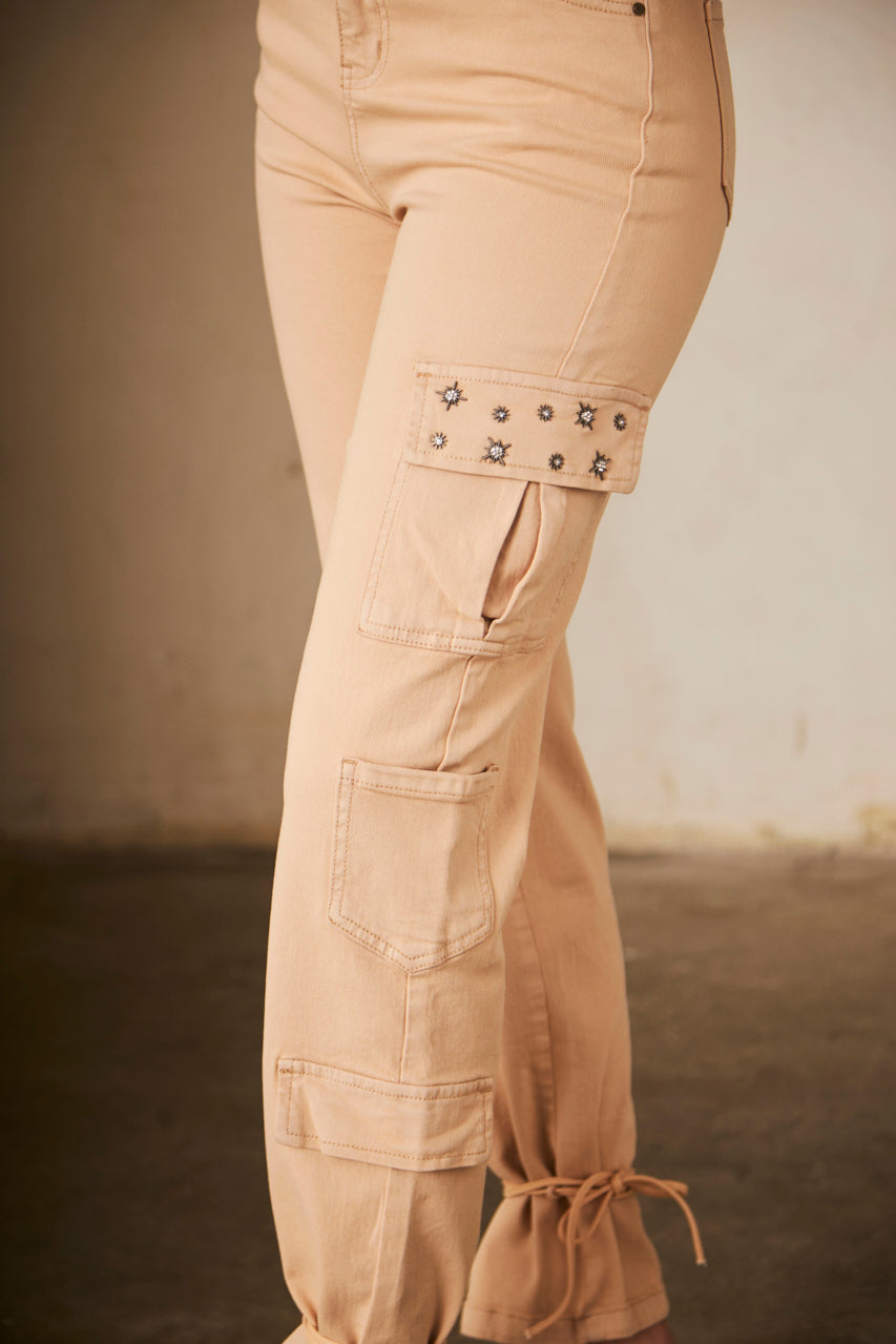 PANTALÓN RECTO SARGA CARGO CON TACHUELAS EN EL BOLSILLO - BEIGE