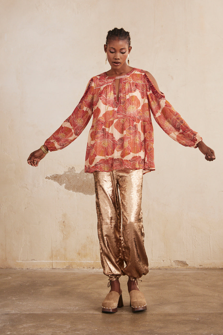 BLUSA OVERSIZE MANGA LARGA ESTAMPADA CON BORDADOS - NUDE