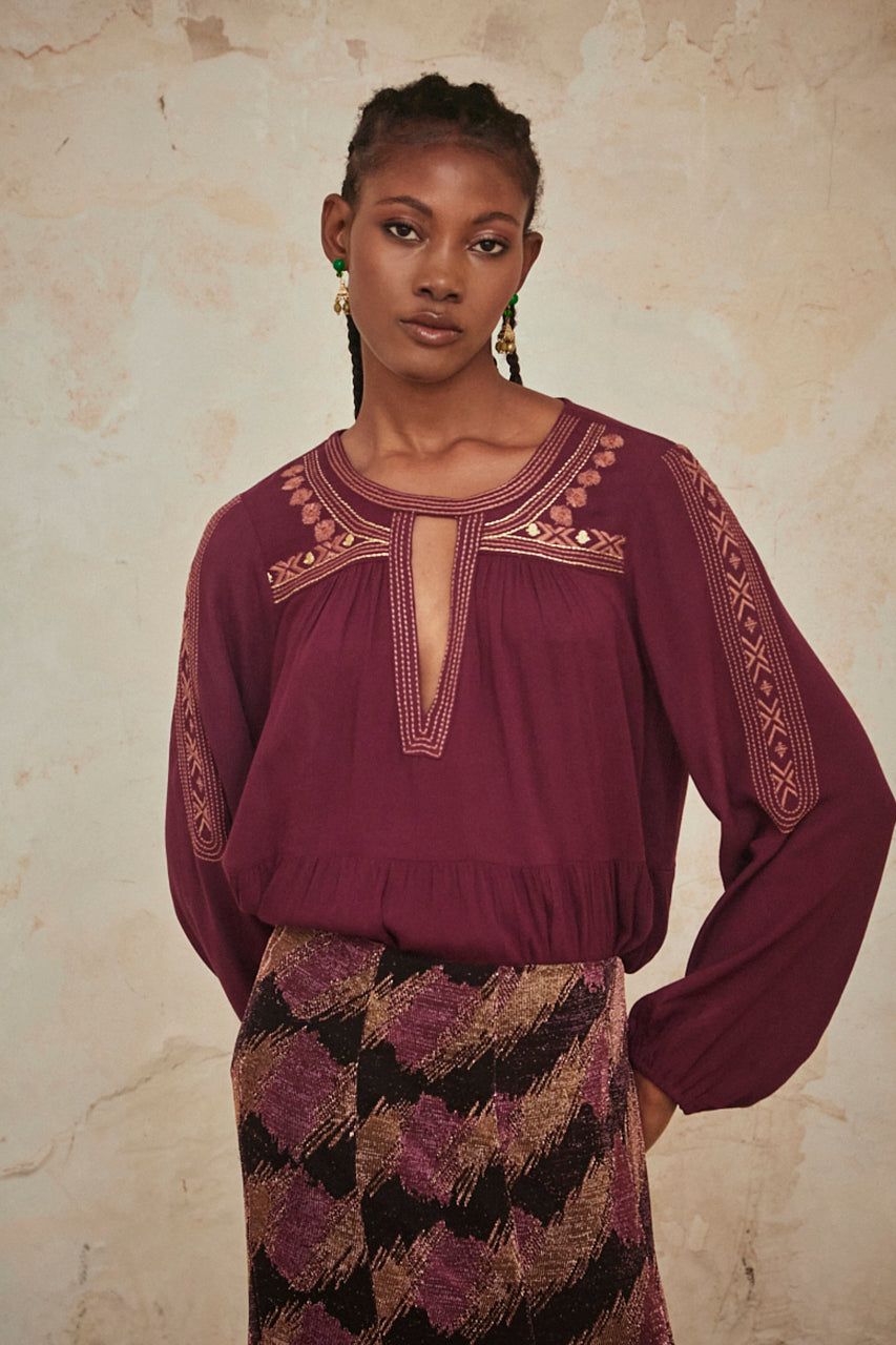 BLUSA OVERSIZE MANGA LARGA ESTAMPADA CON BORDADOS - WINE