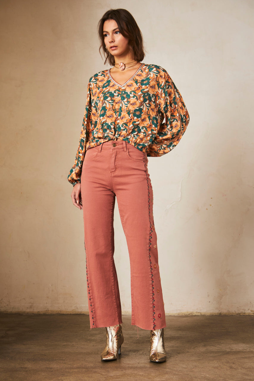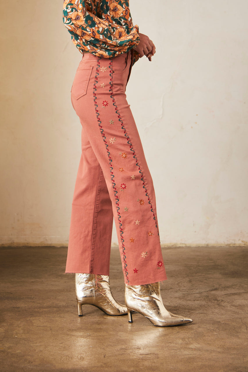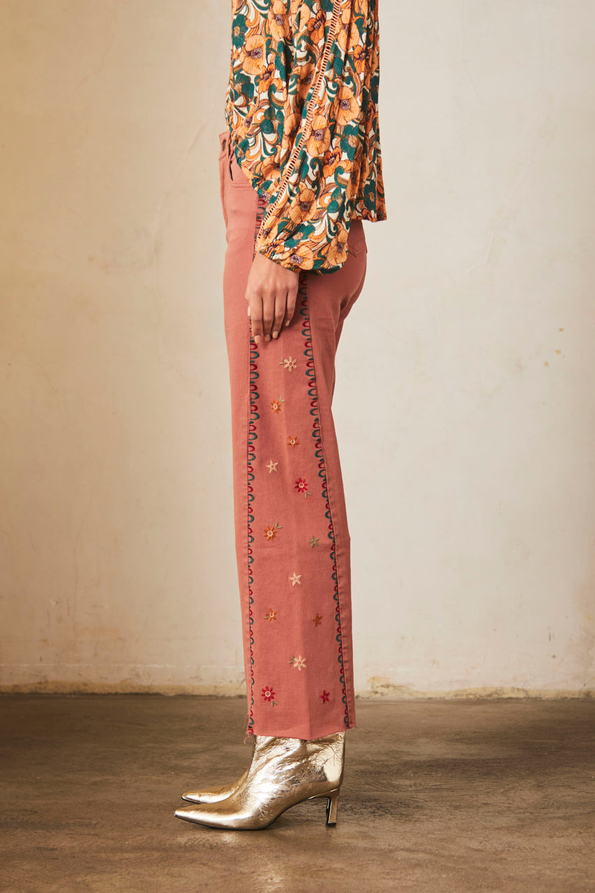 PANTALÓN AMPLIO DENIM CON BORDADO - BRICK