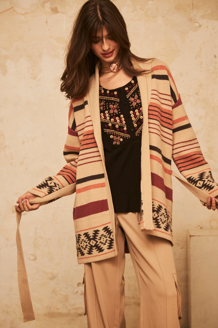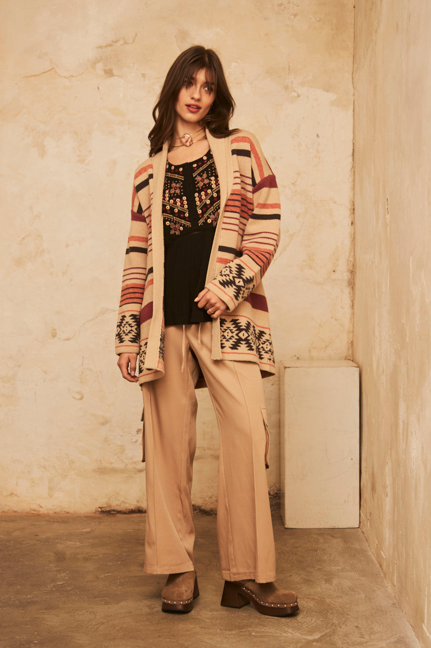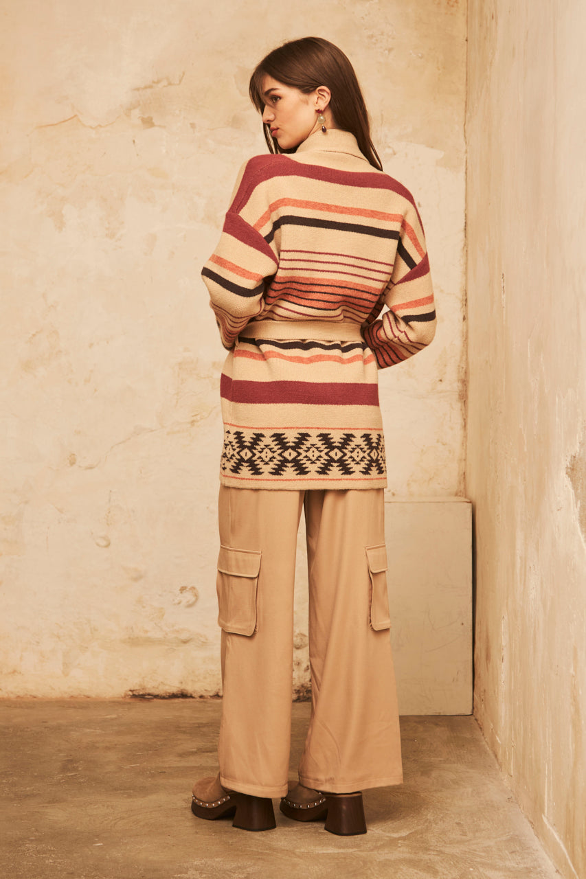 CARDIGAN OVERSIZE MANGA LARGO LISTADO CON JACQUARD EN EL BAJO - IVORY