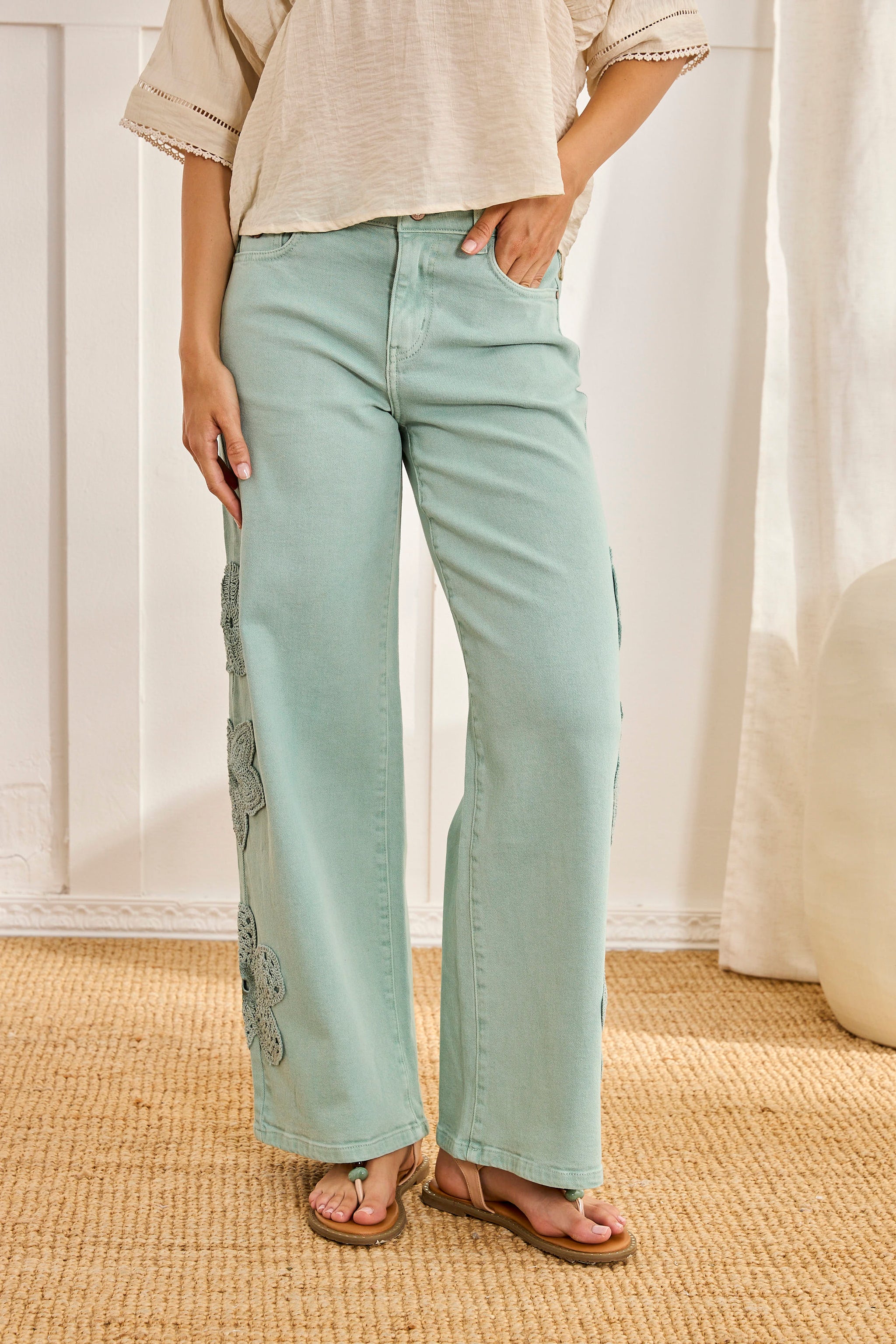 JEANS RECTOS BORDADO FLORAL - AZUL
