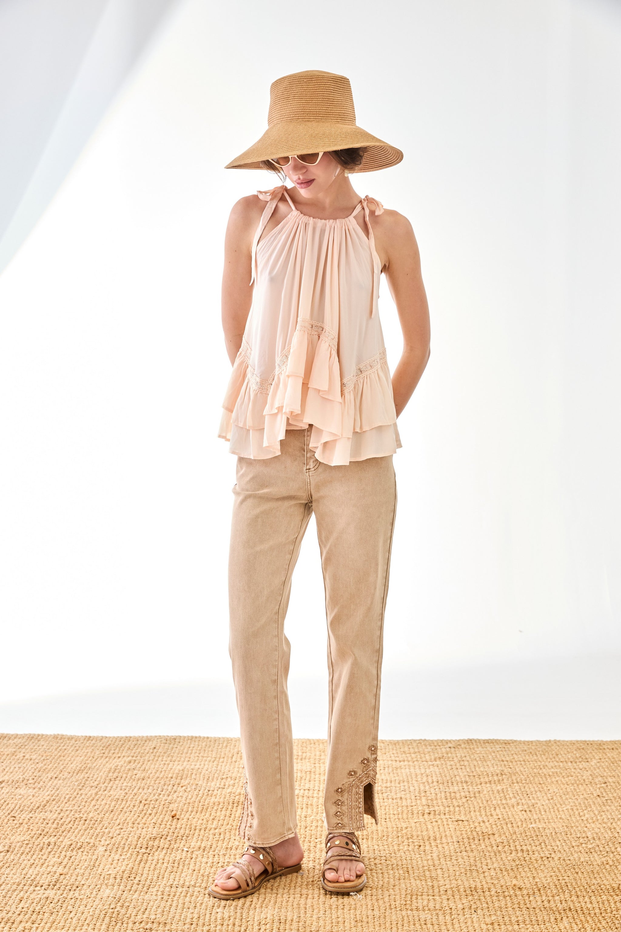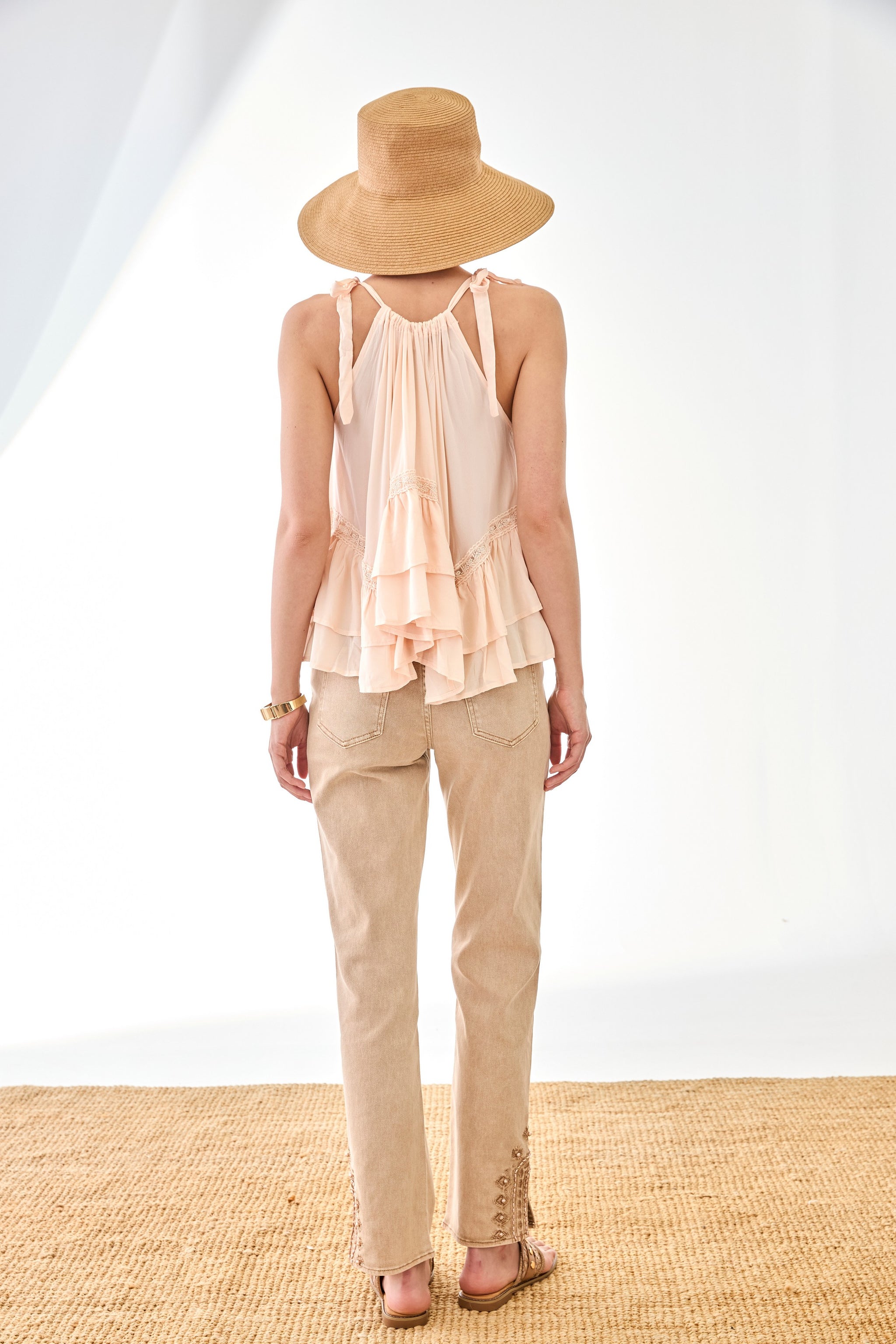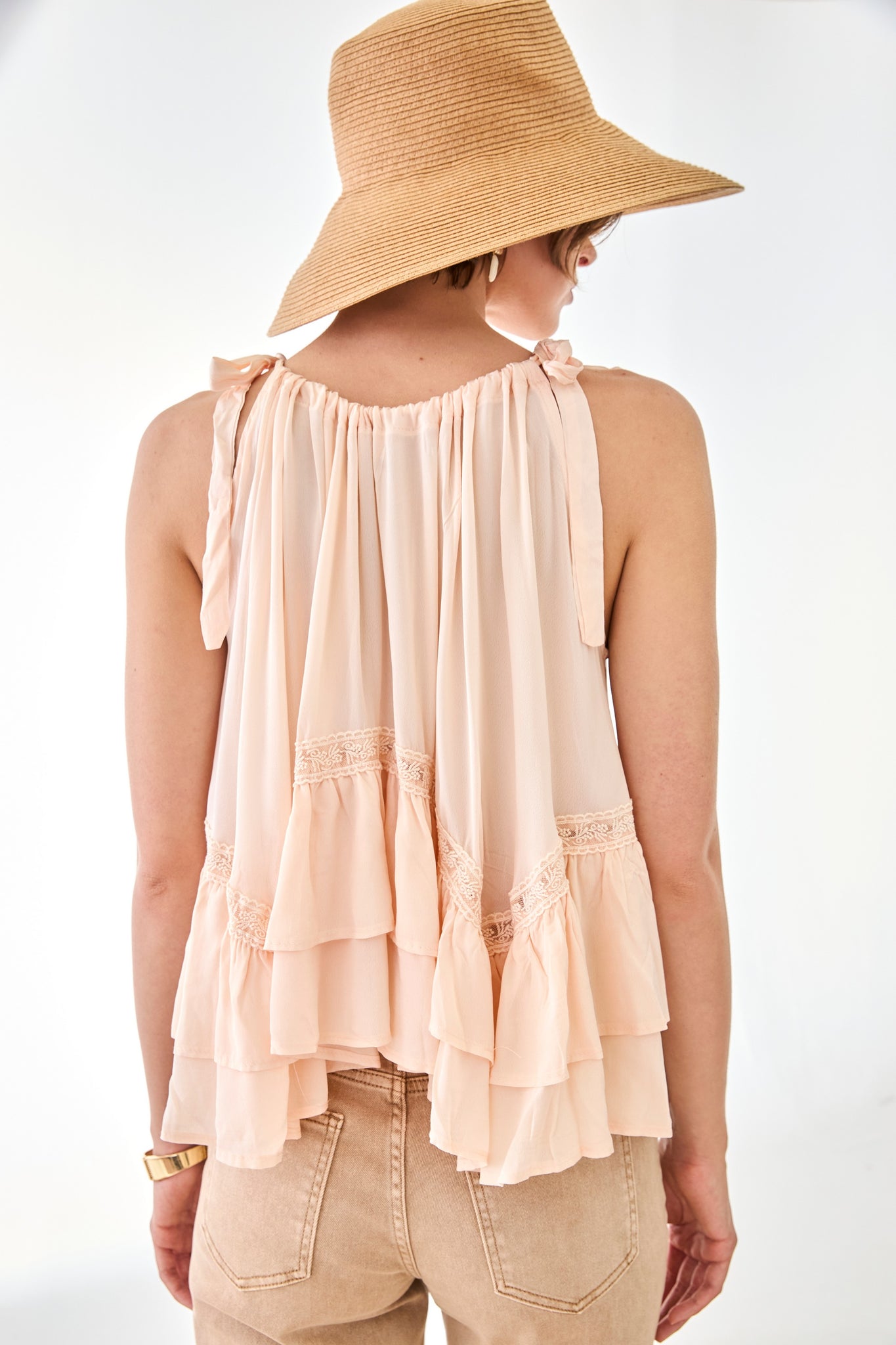 Top de tirantes finos anudados en los hombros y cuello fruncido. Detalle de cinta de blonda sobre el bajo de volantes.
