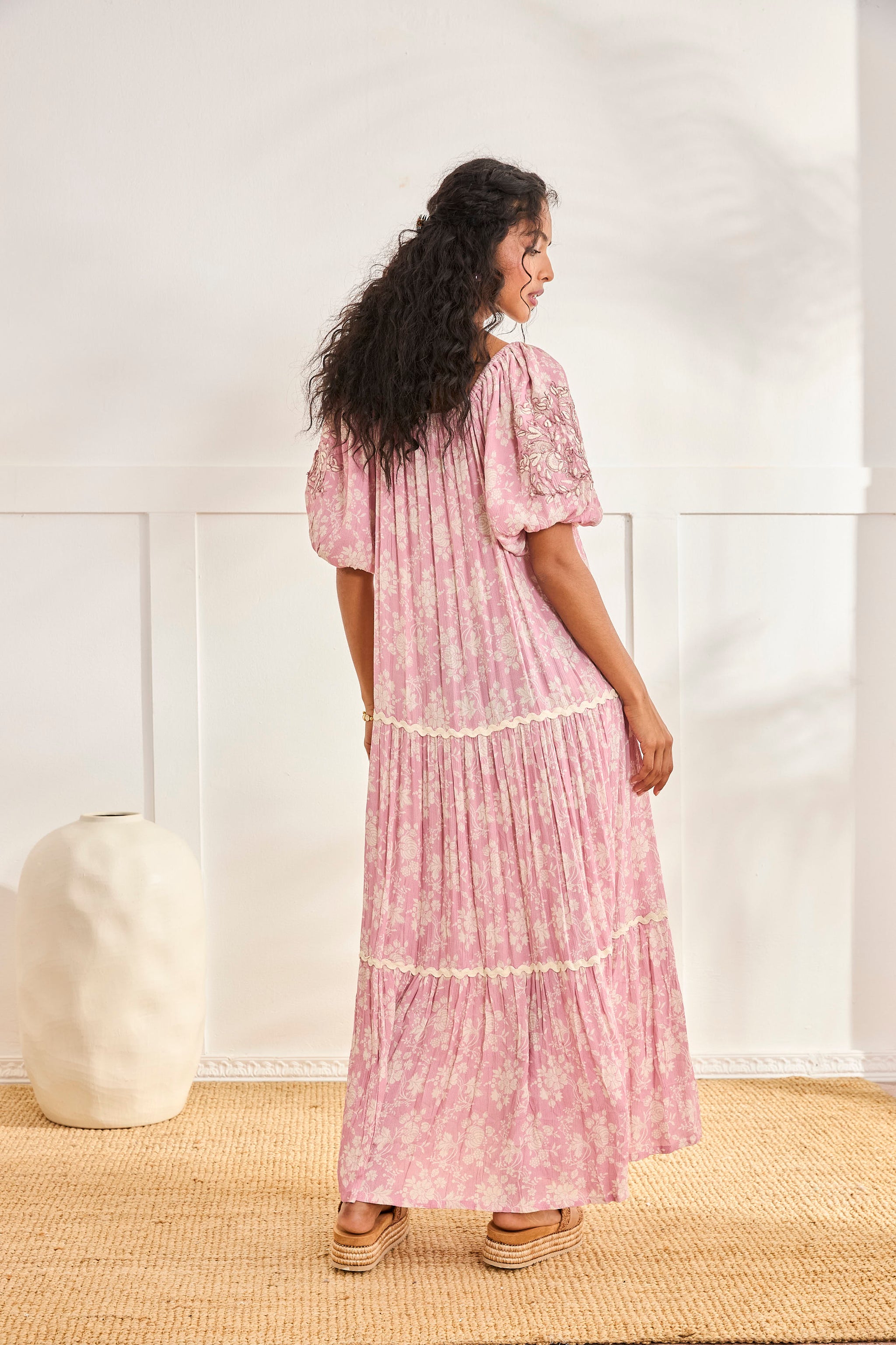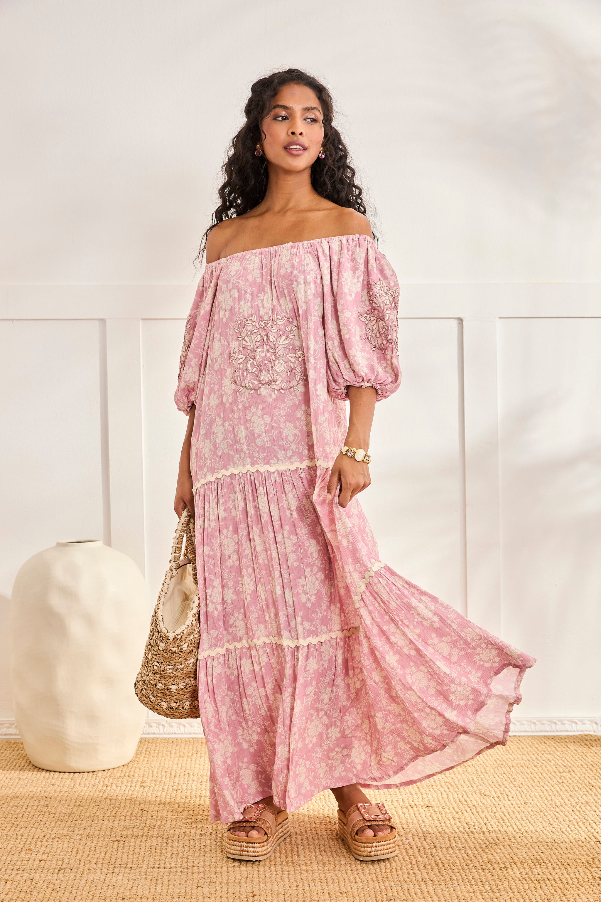 VESTIDO FLORES ESCOTE BARDOT - ROSA