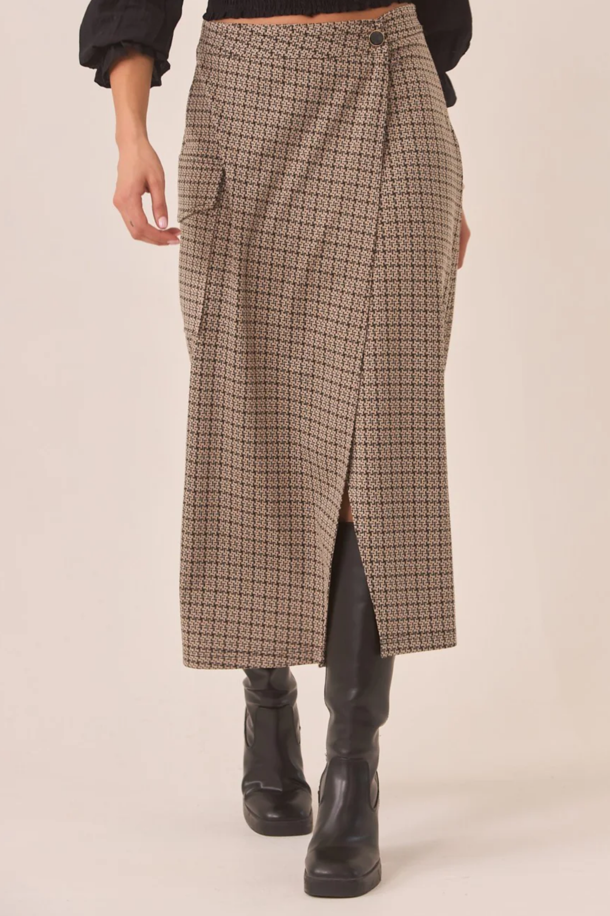 Falda midi estampada con bolsillo de solapa y botón lateral.