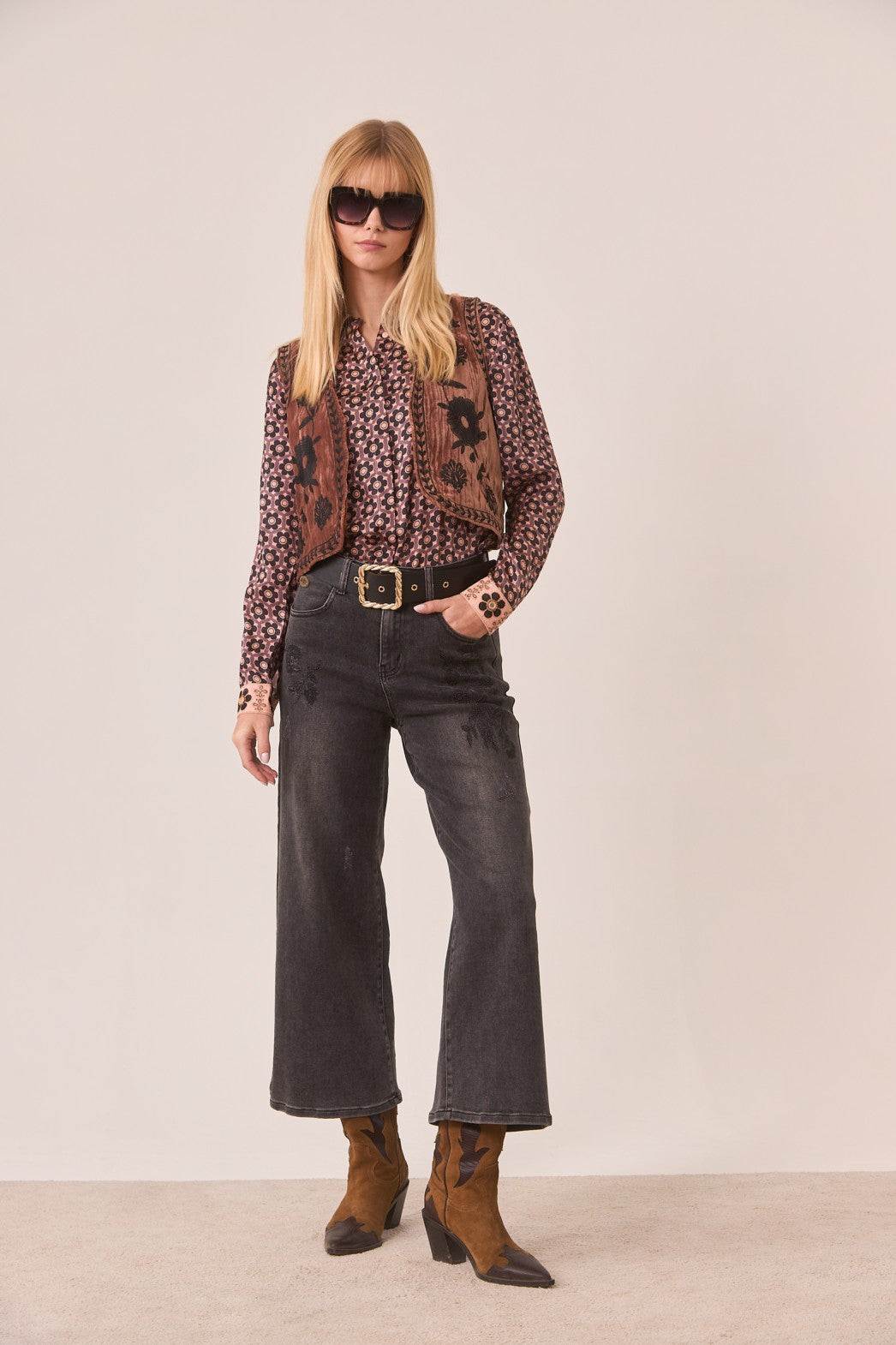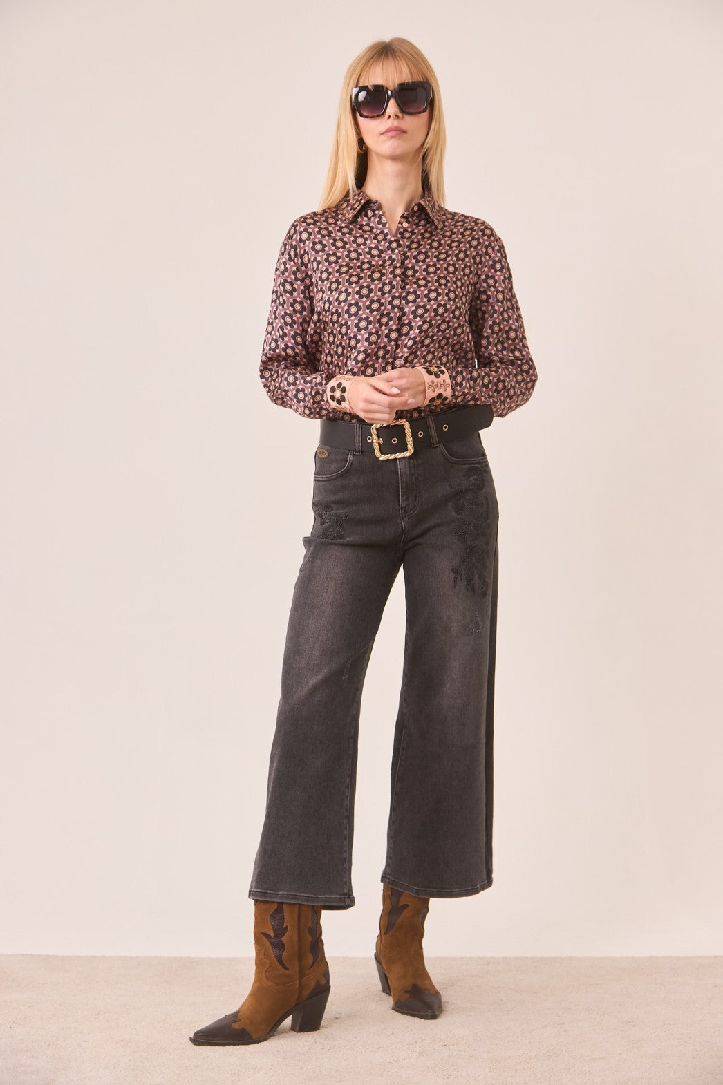 Blusa de corte camisero estampada. Detalle de bordados en los puños.