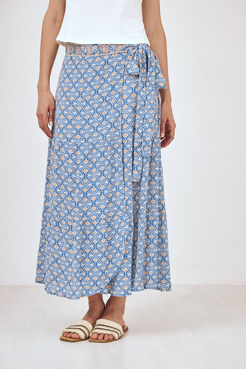FALDA PAREO MIDI CON ESTAMPADO BORDADO - AZUL
