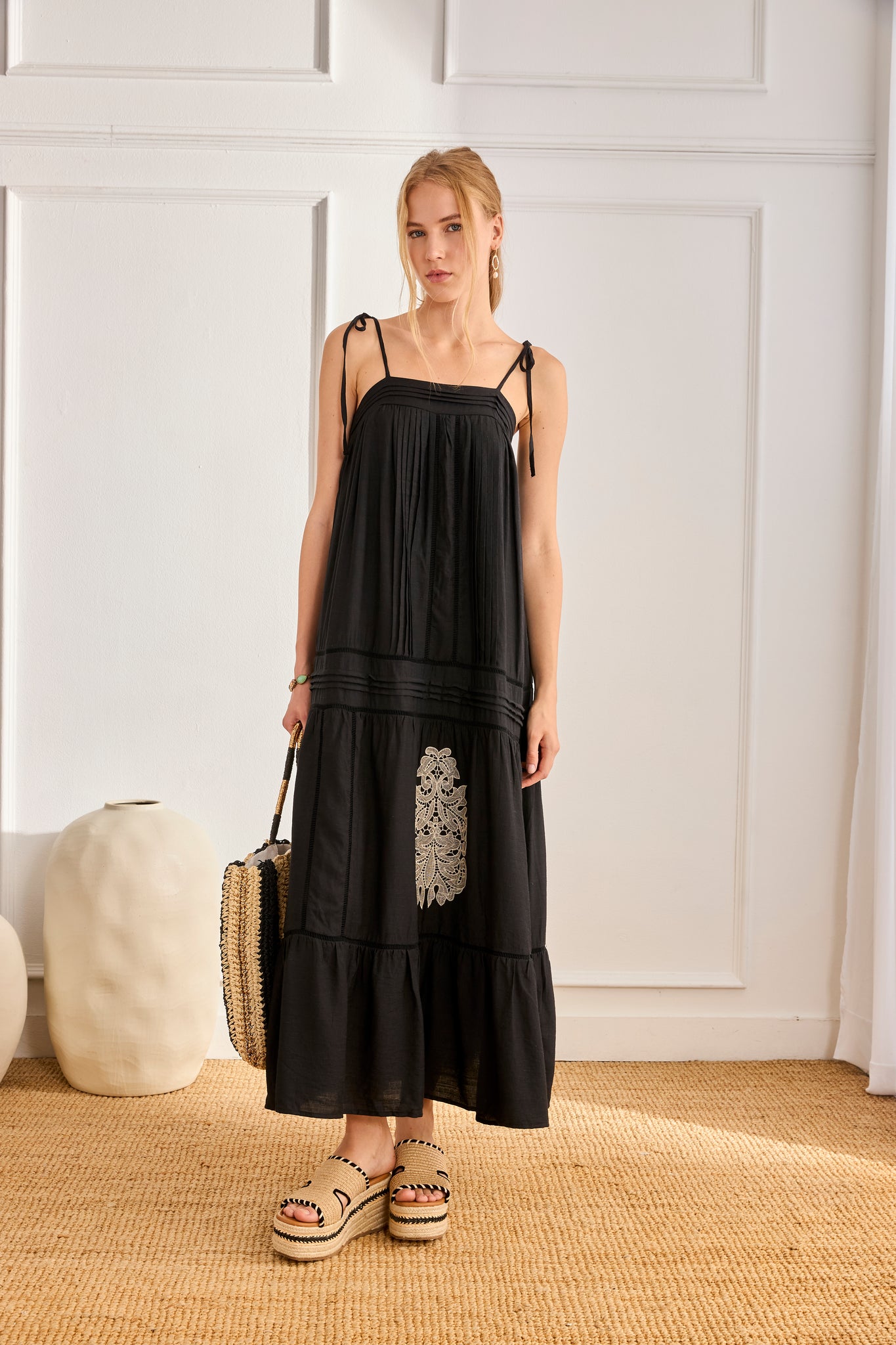 Vestido largo de tirantes finos anudados en los hombros y escote cuadrado. Detalle de plisados y calados. Bajo con volante. Cierre de botones en la espalda superior.
