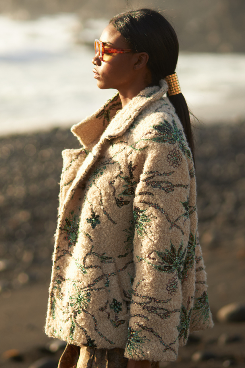 Abrigo corto en borreguito con motivos florales bordados y decorados con lentejuelas. Cuello de solapas.