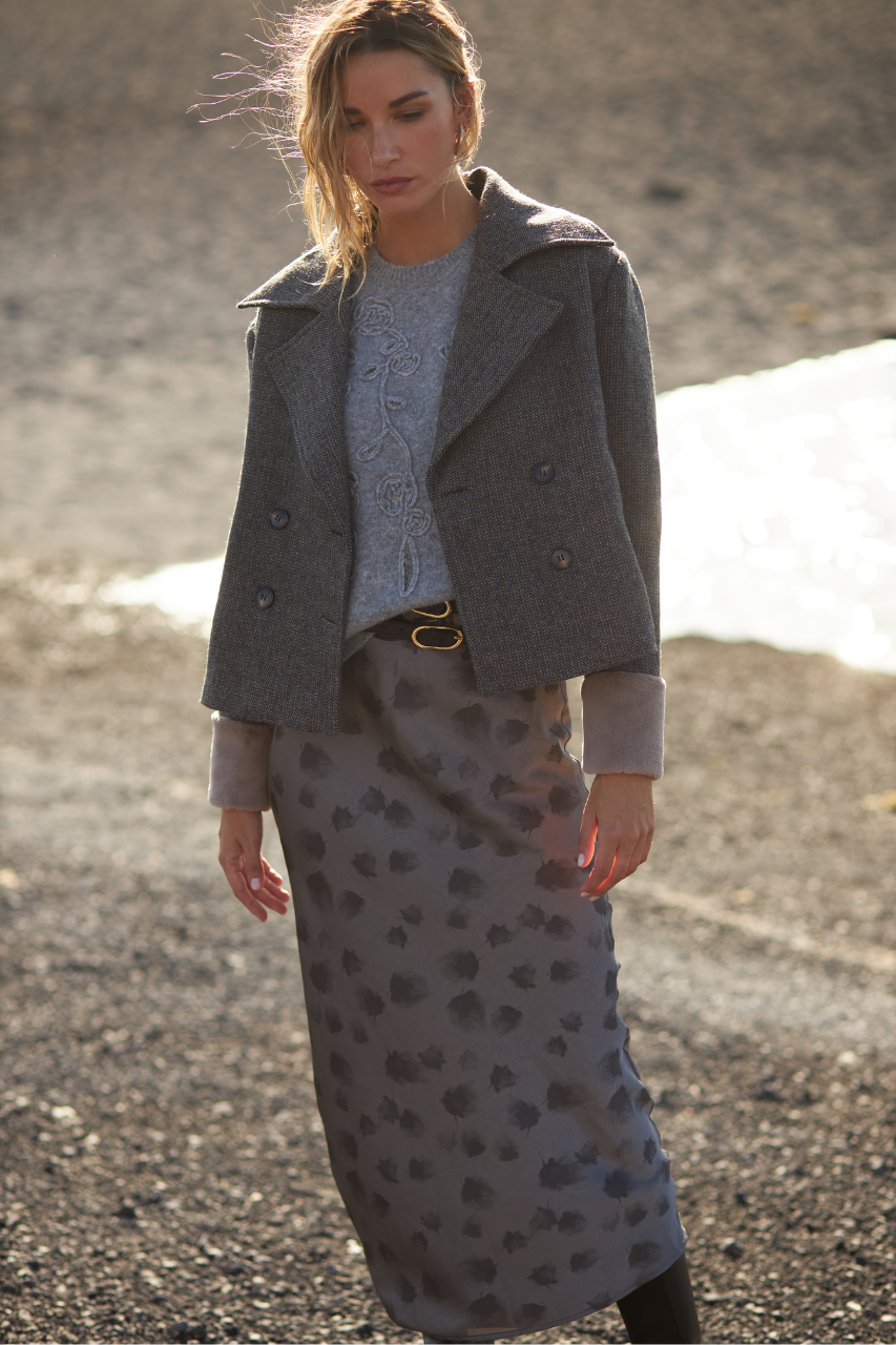Abrigo corto con cuello de solapas, doble botonadura y bolsillos. Detalle de pelo en los puños.
