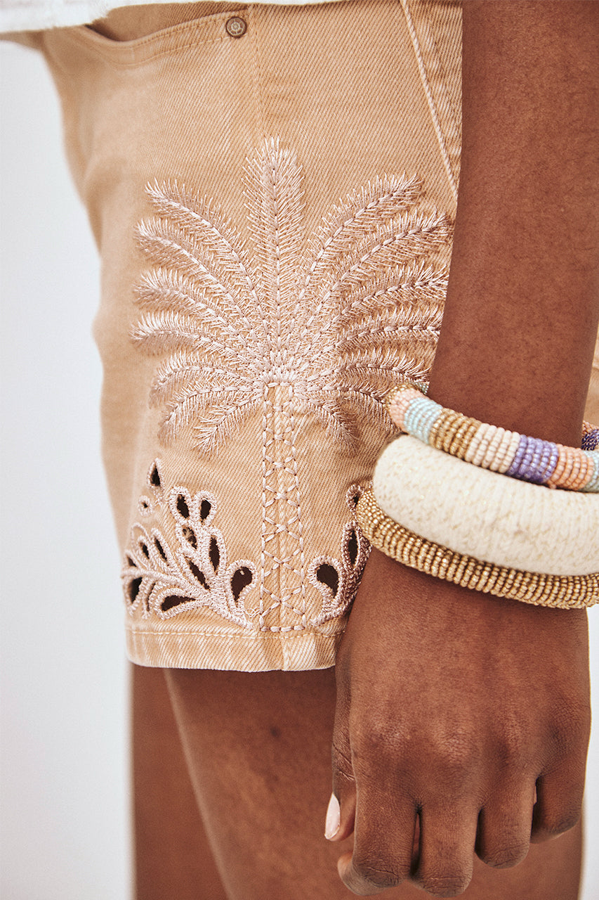 SHORT DENIM CON BORDADO PALMERAS - CAMEL